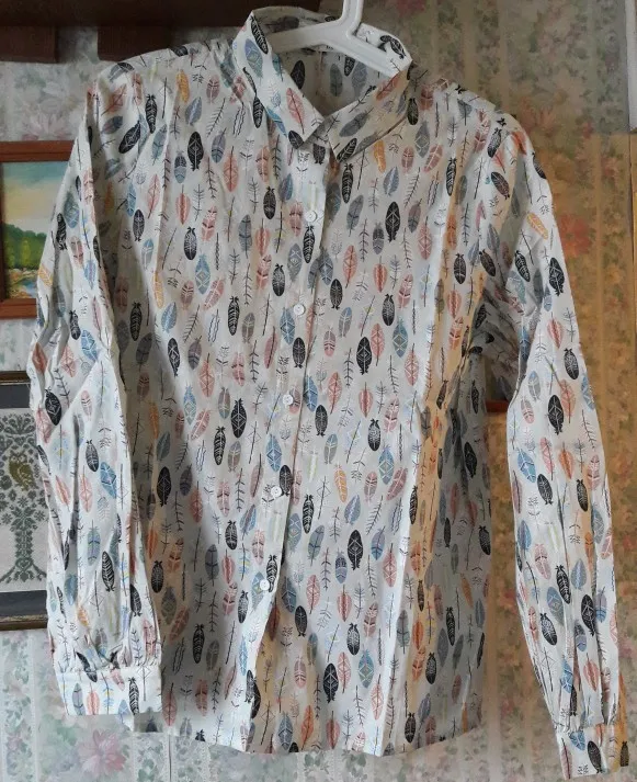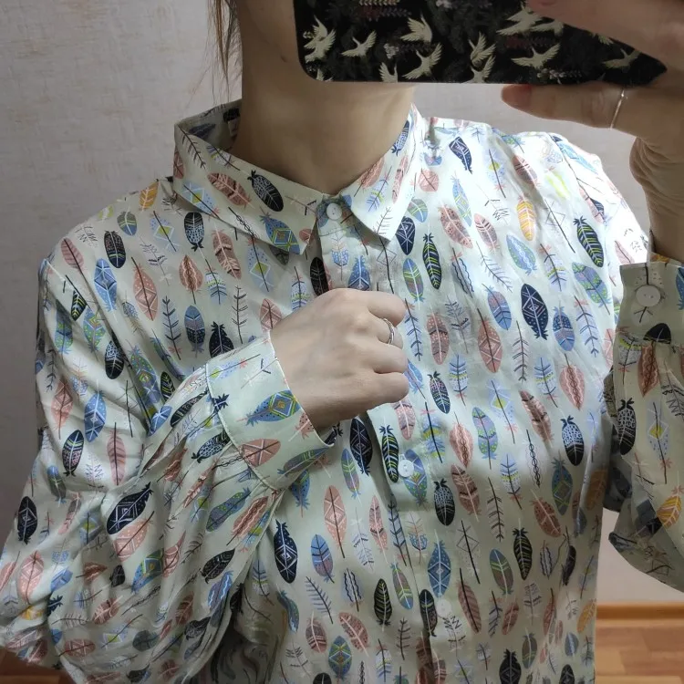 Качественная фабричная рубашка. Ярлыки на месте (один в боковом шве, один на воротнике), в комплекте - запасная пуговица. Цвет блузки не белый, а чуть сероватый, листики голубее, персиковые, темно-темно синие, почти чёрные, есть белые, коричневые и желтые штрихи. На параметры 92-72см, рост 164 , вес 55, взяла размер L, мне впритык, ещё сантиметр и будет мало в груди. На самом деле L - это наш 44 размер, это написано на ярлыке. Рукава нужной длины, думаю, что на рост до 170 подойдёт.