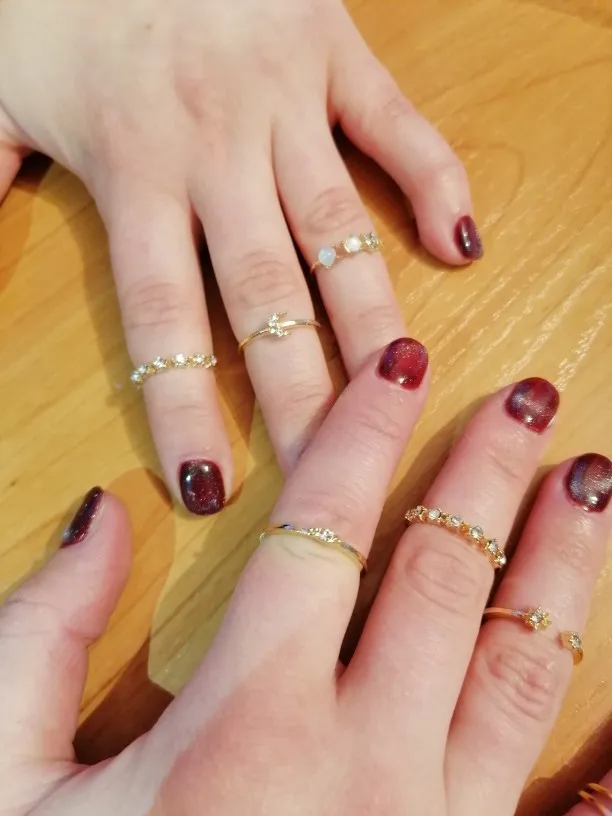 prstene majú asi iba 2 veľkosti a aj to veľké takže pokiaľ nieje pribratá ruka tak sa prstene nedajú použiť tak ako je uvádzané na fotografií. vyzerajú strašne lacno, nespracované dobre.
