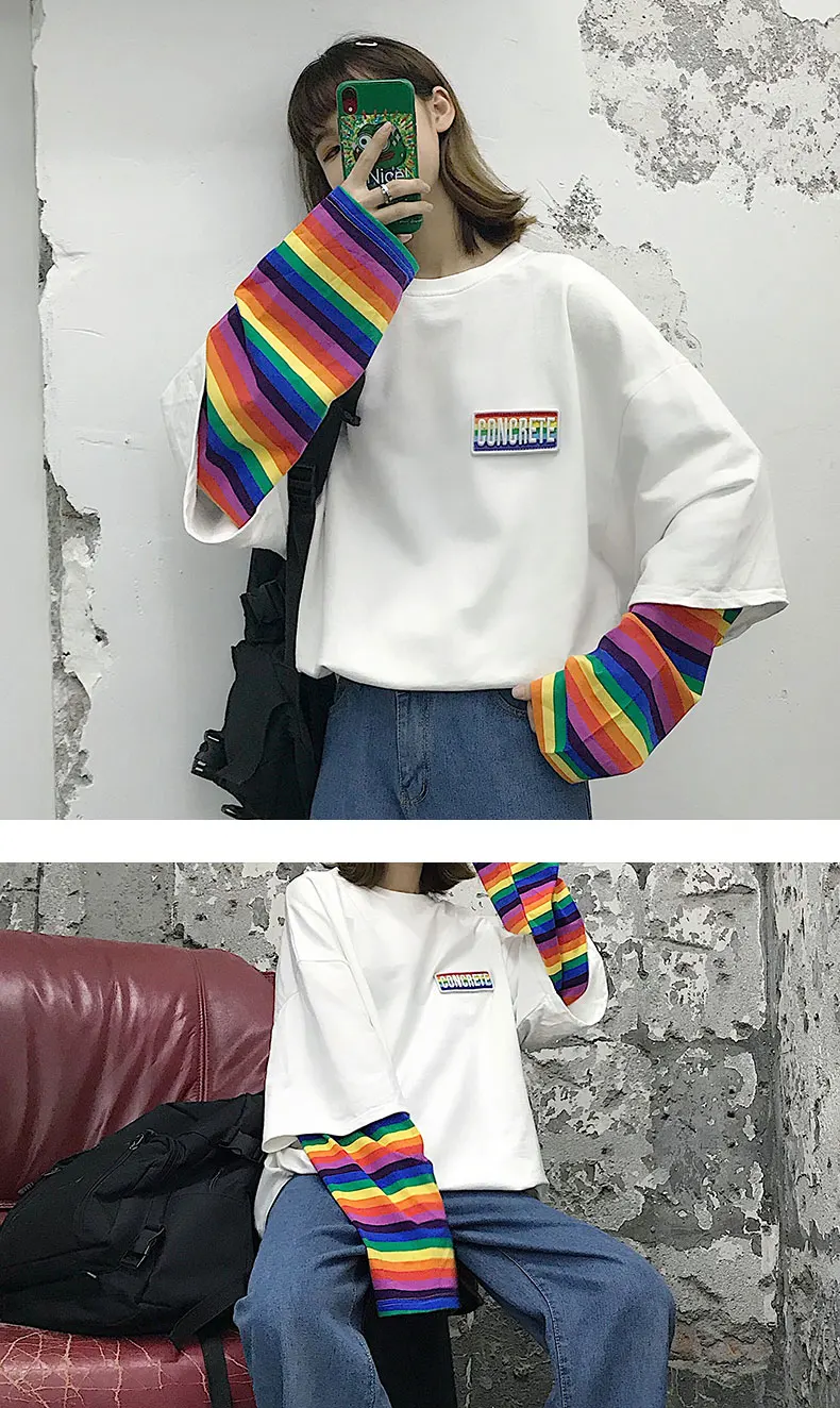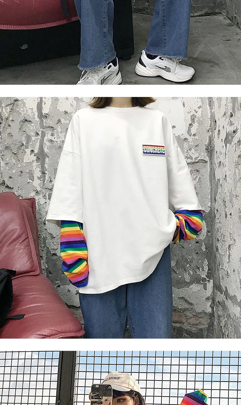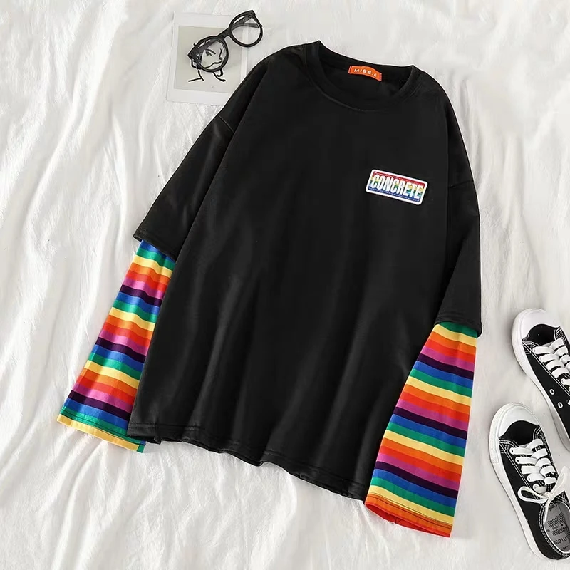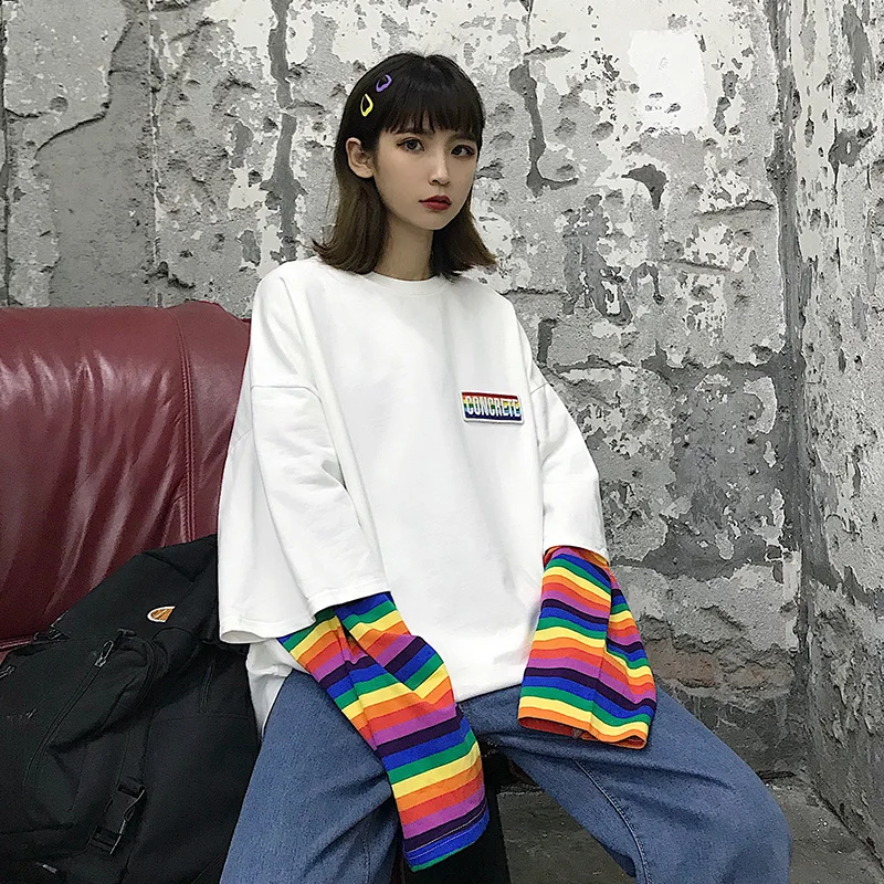 Кавайные футболки для студентов, свободные топы, радужная имитация двух футболок, Женская Новинка 2020, полосатая крутая Одежда большого размера с длинным рукавом