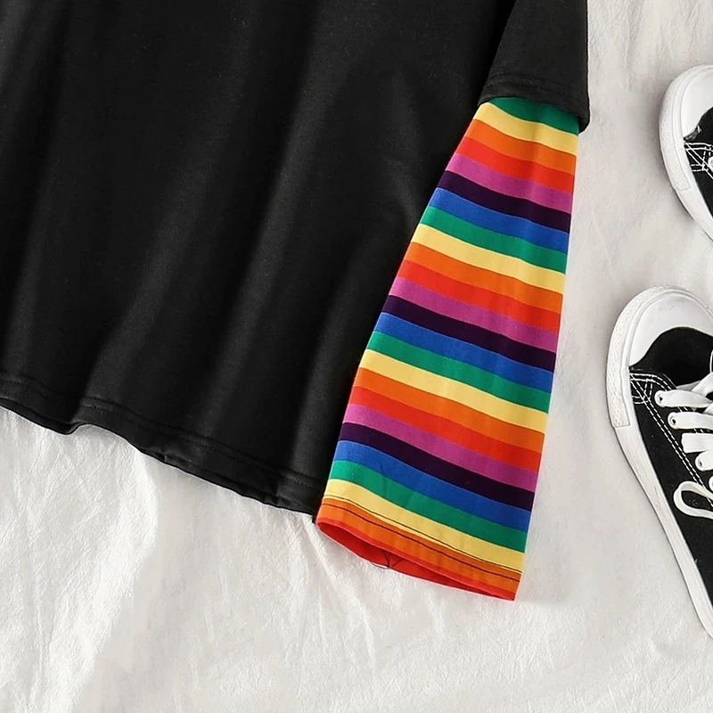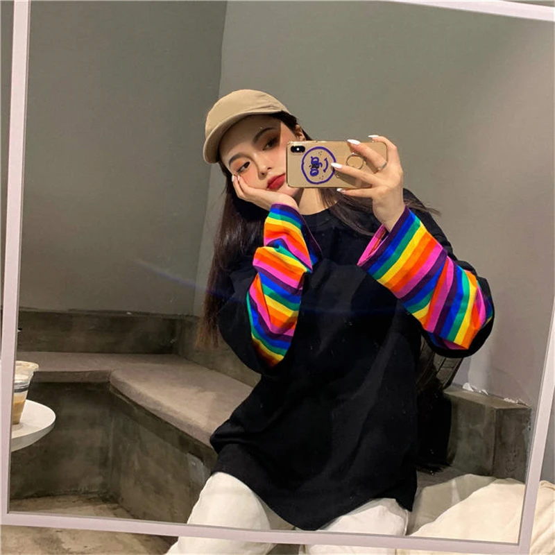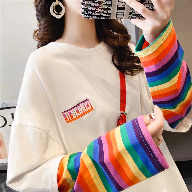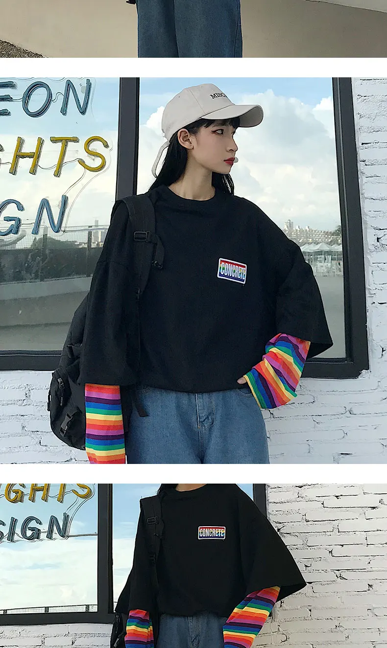 Кавайные футболки для студентов, свободные топы, радужная имитация двух футболок, Женская Новинка 2020, полосатая крутая Одежда большого размера с длинным рукавом