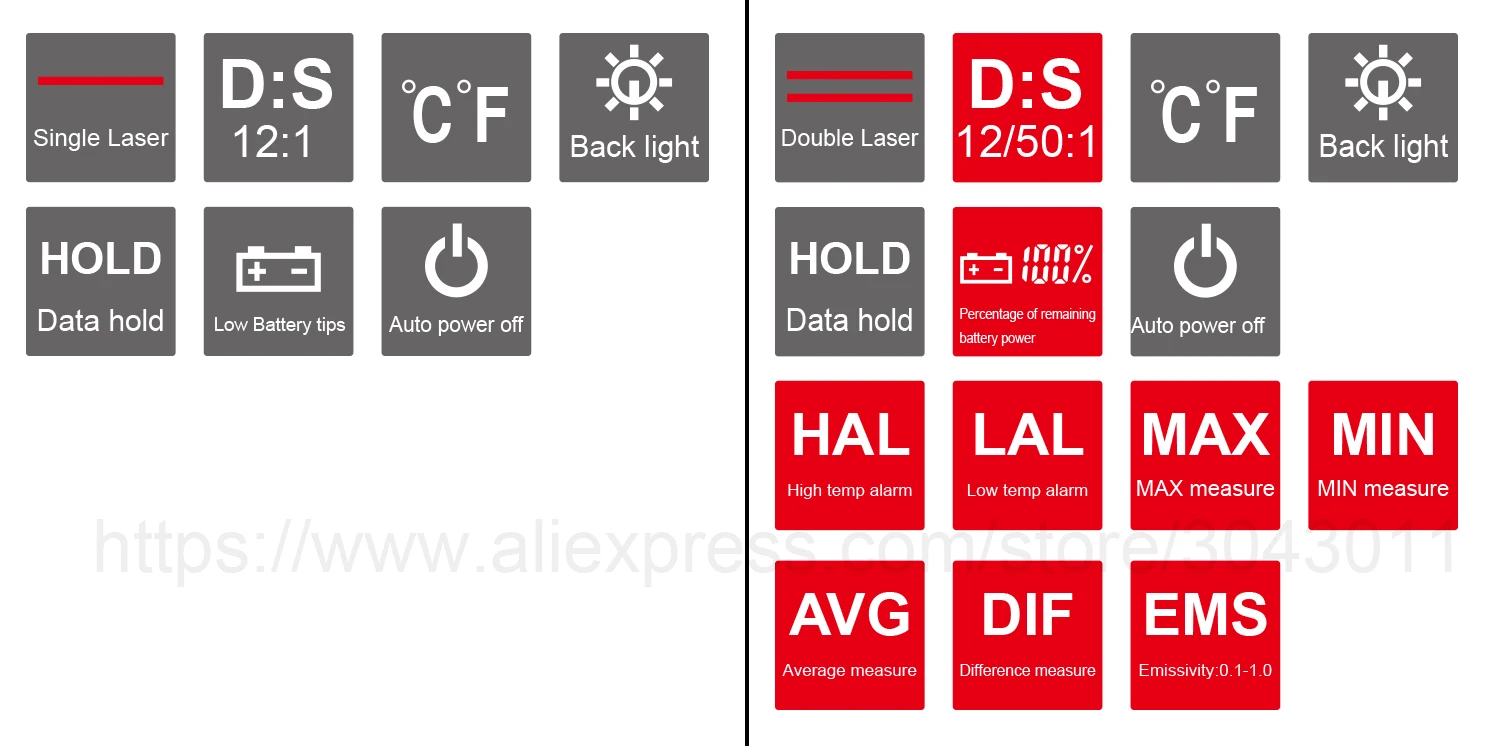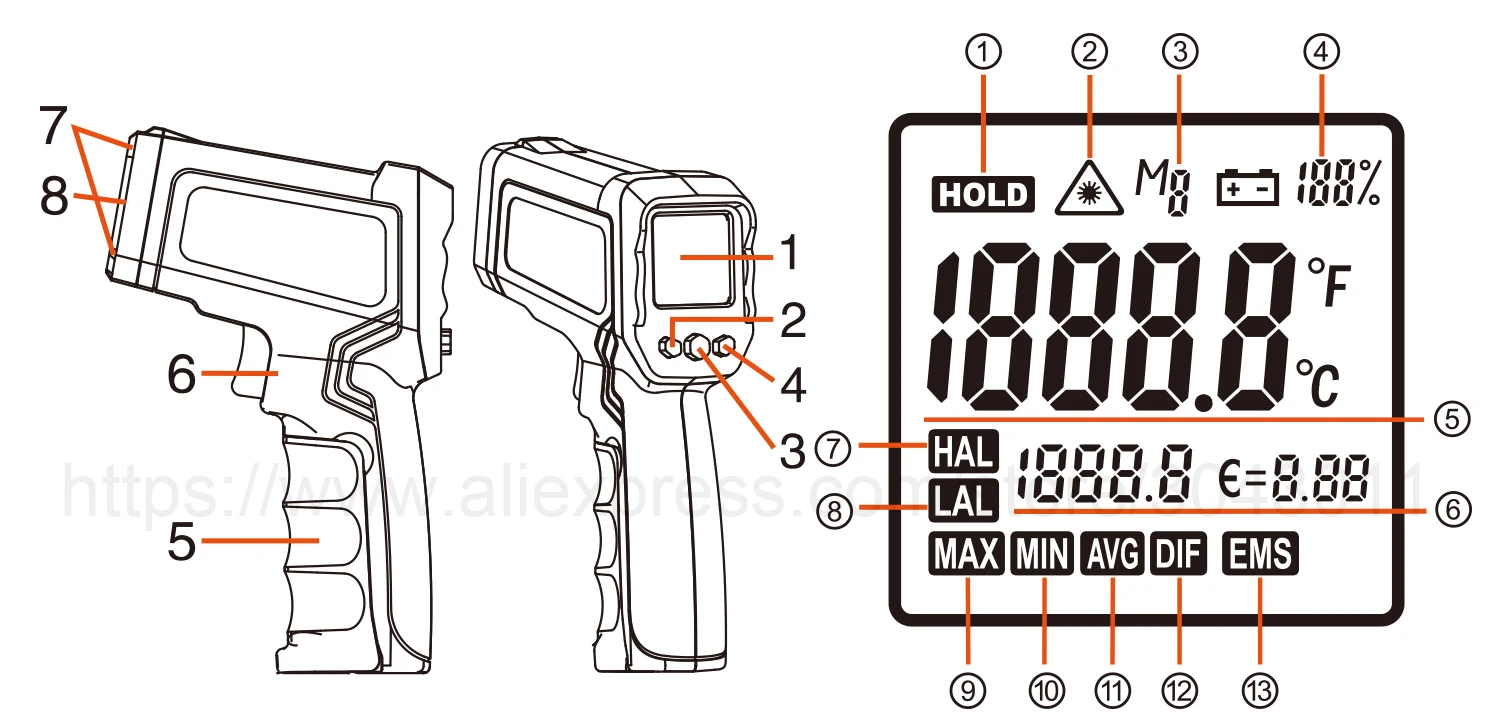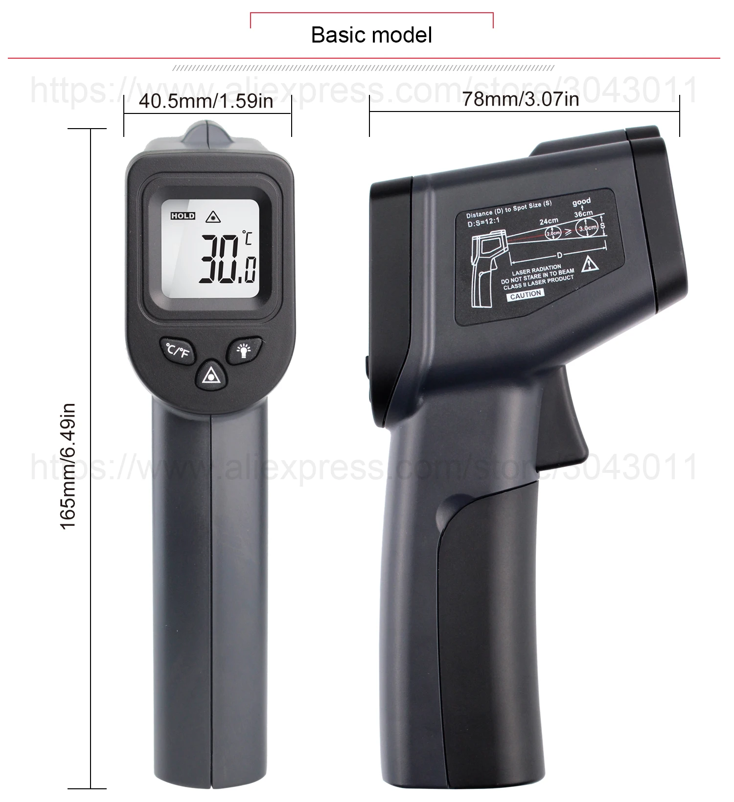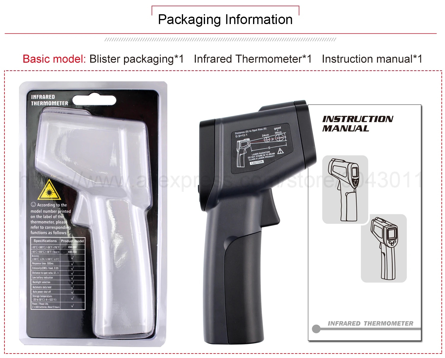 Одиночное/двойное лазерное измерениеОсобенности:• Лазерная указка для точного прицеливания• Простое управление одной рукой• ЖК-дисплей со спинкой светильник• Переключатель включения/выключения лазера• Индикация низкого заряда батареи• Светодиодный светильник для работы при плохом освещении• Преобразование температурного блока C /F• Автоматическое выключение в течение 15 секунд без каких-либо действий• Удержание дисплея, функция сканированияПримечание:1. При использовании этого продукта для измерения температуры учитывайте соотношение между расстоянием (длиной от продукта до измеренного объекта) и размером области измерения, обозначается как отношение Расстояния объекта. Когда расстояние между продуктом и измеренным предметом увеличивается, площадь измерения будет соответственно увеличиваться.2. Если вы хотите использовать кипяченую воду для измерения качества продукта, обратите внимание, что при измерении кипящей жидкости не допускайте попадания дыма или водяного пара в зону измерения температуры, И удерживайте угол измерения на 45-60 градусов.【Примечание. Термометр не может измерять внутреннюю температуру объекта; Показания температуры от этих устройств являются неодушевленными предметами, измеренная температура для людей или животных не будет правильной【Note】 fcc, CE,ROHS сертификат и Kaemeasu гарантия продукта. Каждый кусок нашей продукции строго проверяется перед продажей.Этот продукт не подходит для измерения температуры поверхности тела, лба, ребенка!