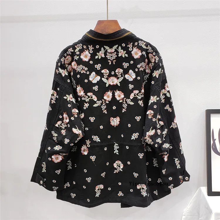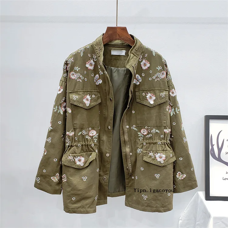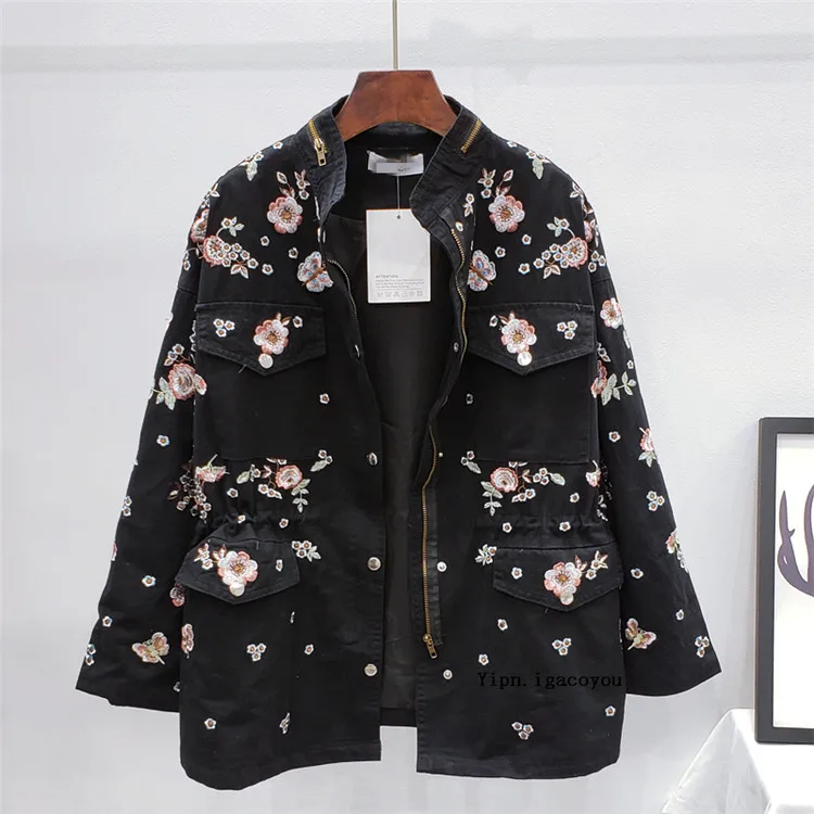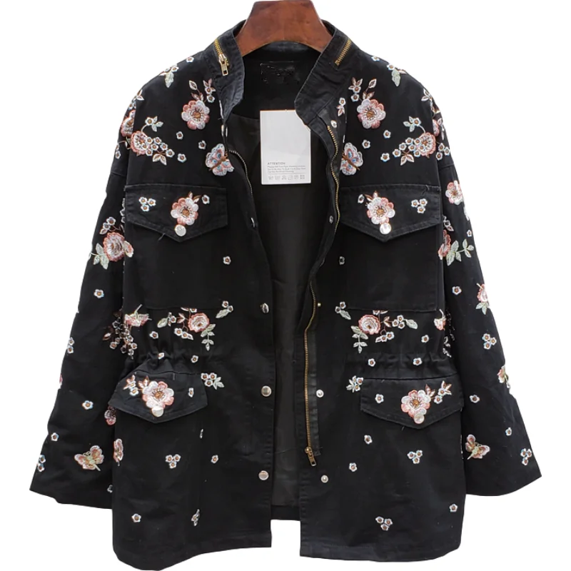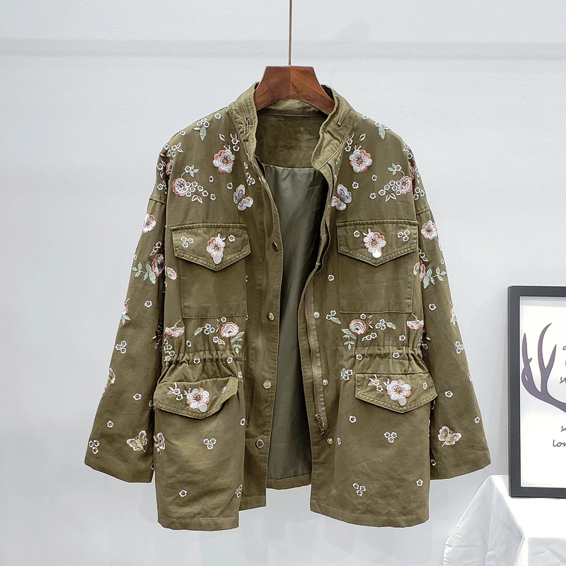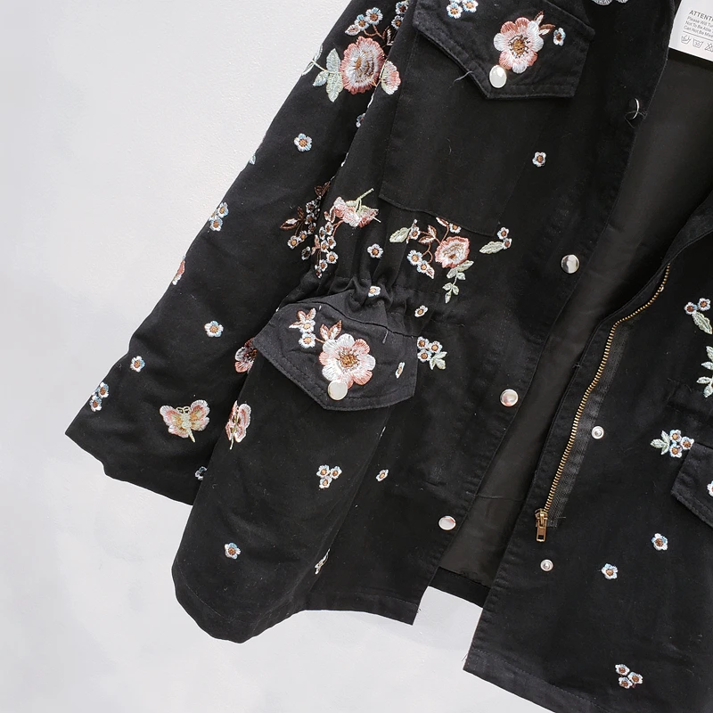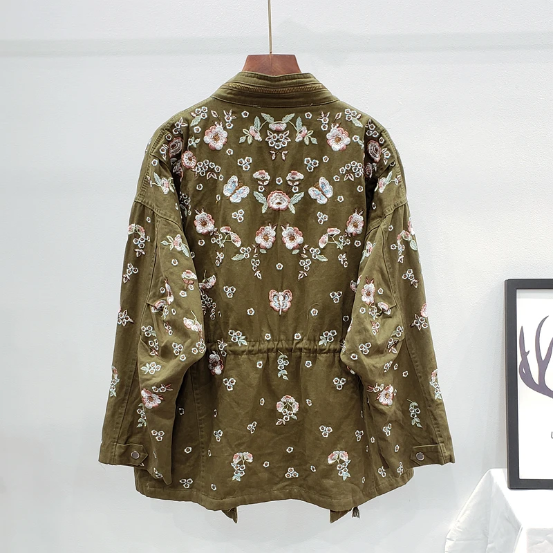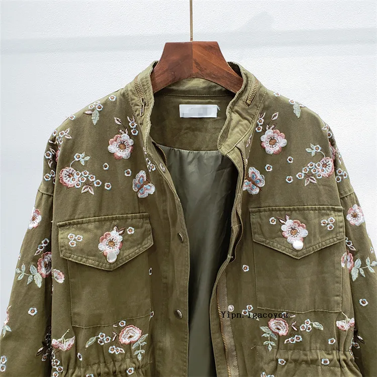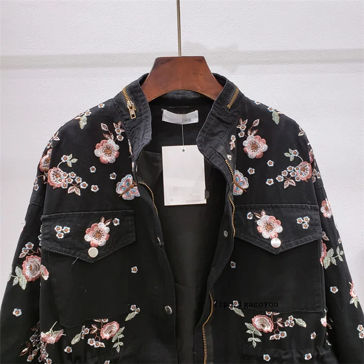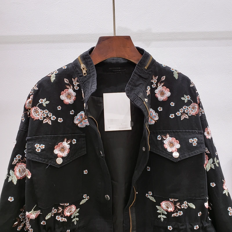 Ветровка женская демисезонная с воротником-стойкой и длинным рукавом, с цветочной вышивкой, с кулиской на талии, H489
