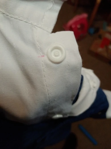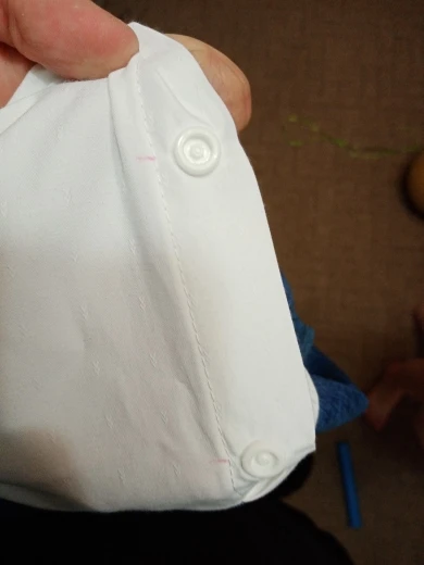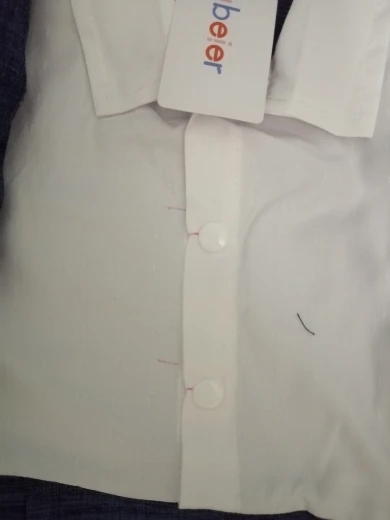 торчат нитки, у пуговок на белой рубашке отметки красным маркером который не отстирывается, качество ткани стейч.