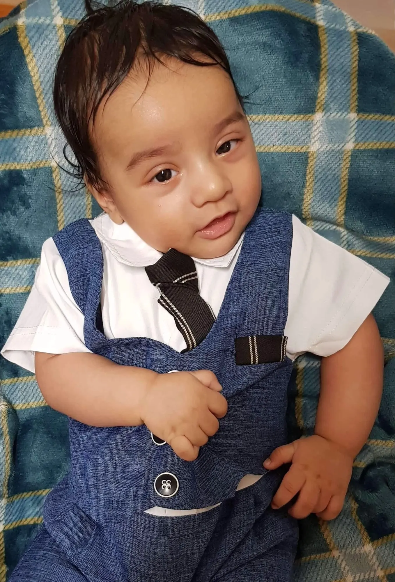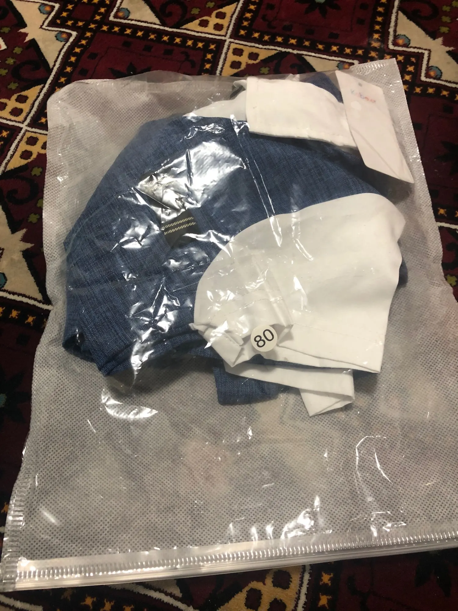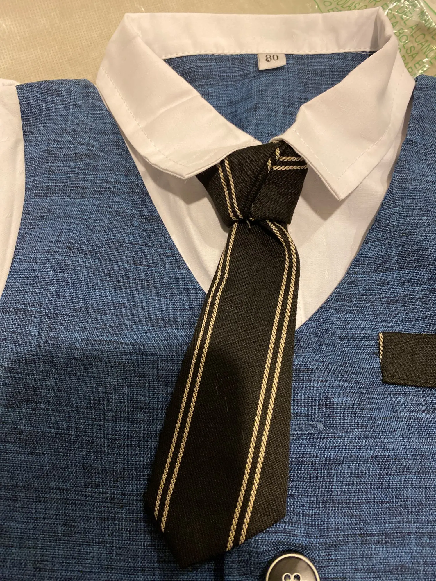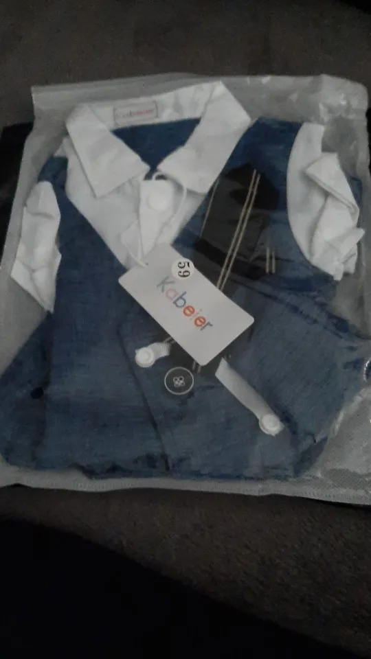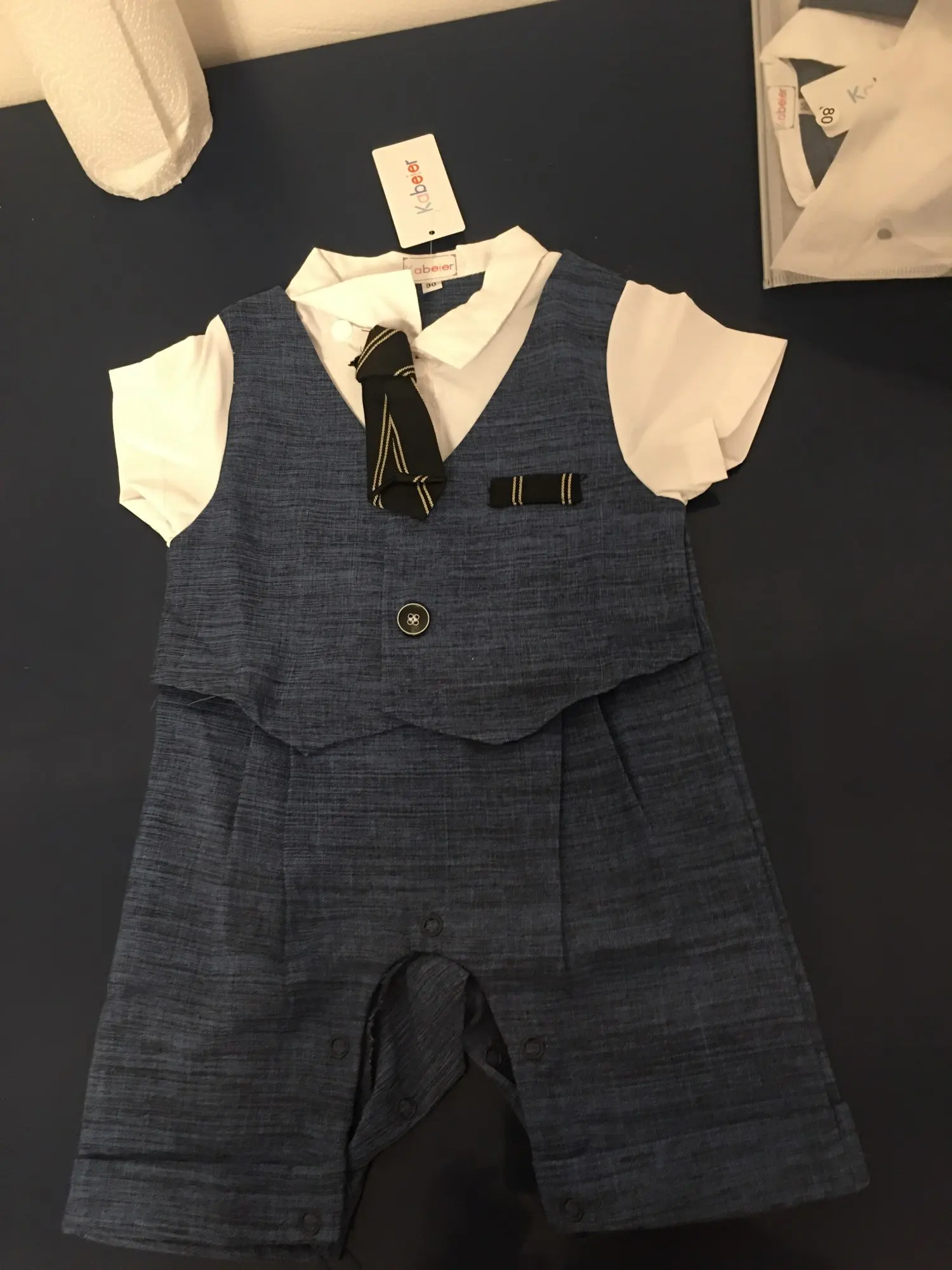 Всякий раз, когда вы заказываете одежду из Китая, вы должны заказать размер или два выше того, который вам подходит, но заказать костюм в течение 18 месяцев (размер 80) И это подходит только ребенку 3 с половиной месяца.