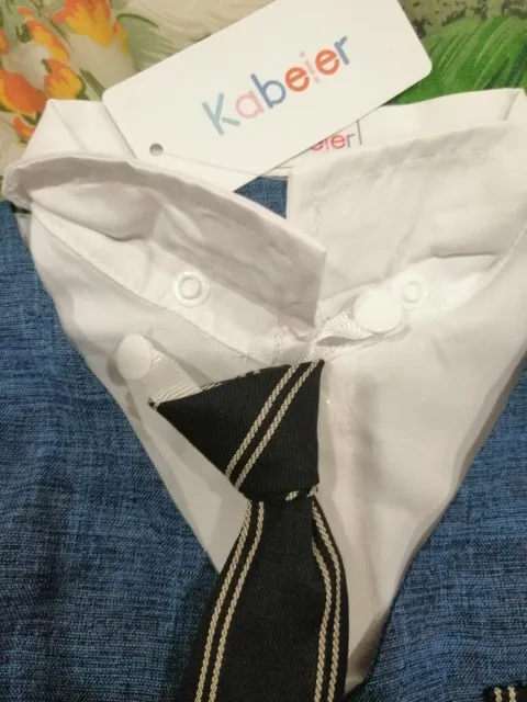Заказ получили спустя месяц после заказа. Материал на ощупь полиэстр+хб, этикетки состава не нашла. Лёгкий и приятный. Однако белая рубашка выпачкана в красный фломастер или ещё что, так и не отстирался. Сильно торчат ото всюду нитки, лучше заново прошить швы на штанишках. Открыла спор за качество.