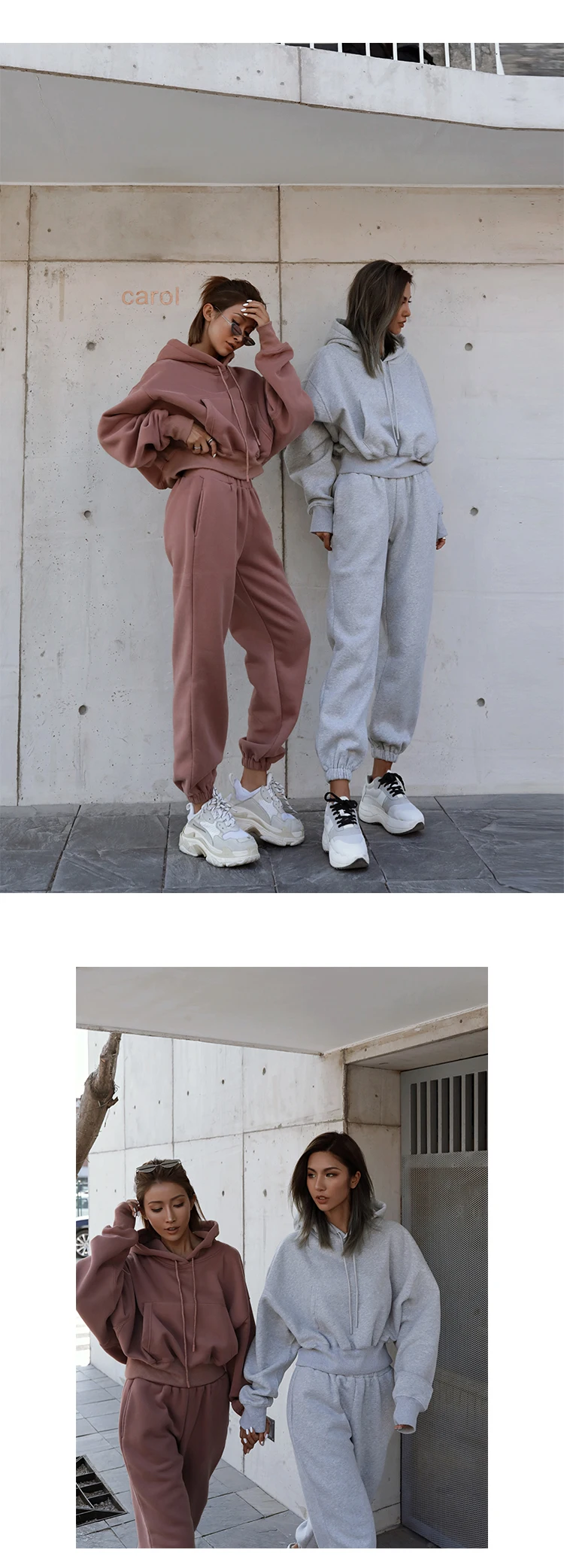 Флисовый спортивный костюм для женщин, спортивные штаны для бега, комплект из 2 предметов, укороченный топ с капюшоном, спортивные штаны, комплект одежды, костюм