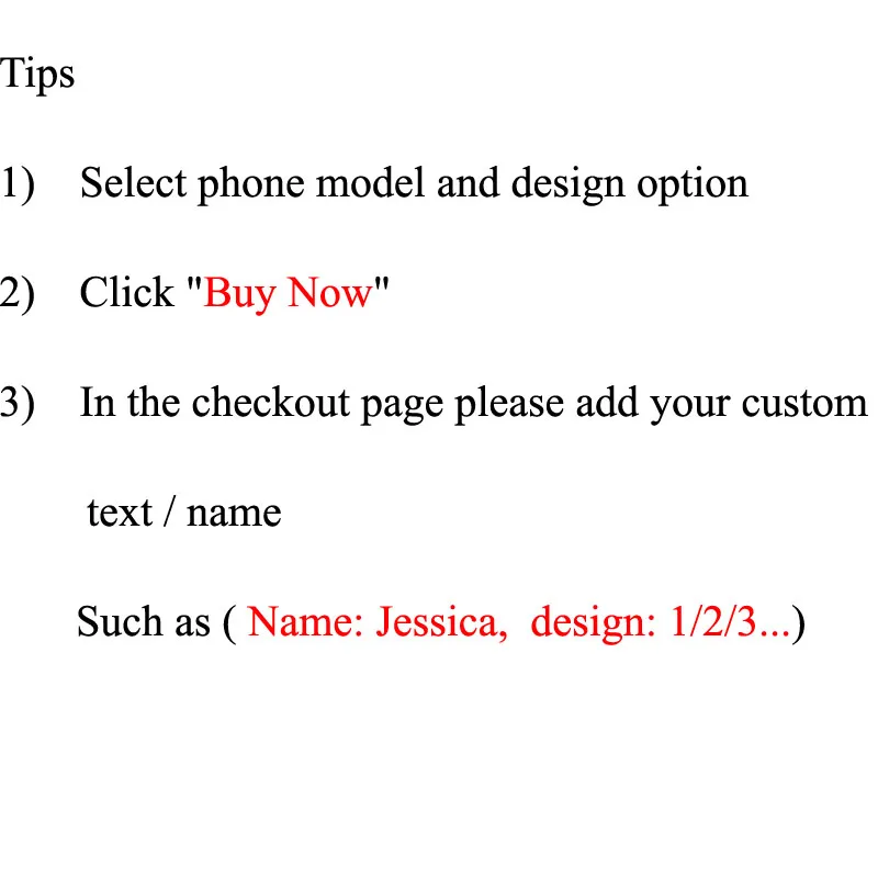 1) Выберите модель телефона и вариант дизайна 2) Нажмите «купить сейчас» 3) на странице оформления заказа добавьте свой пользовательский текст/Имя Такие как (название: Jessica, дизайн: 1/2/3...)