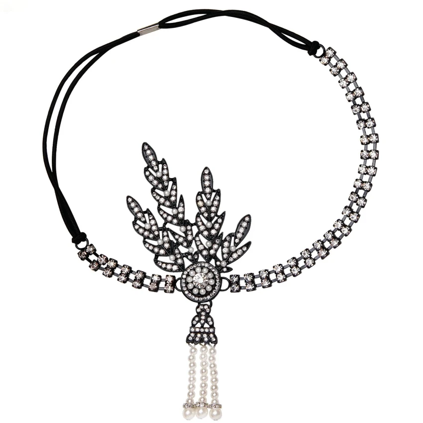 1920s Хлопушки Великий Гэтсби аксессуары комплект лист медальон, повязка на голову с жемчужиной, черные перчатки мундштук, костюм из 3 предметов, комплект
