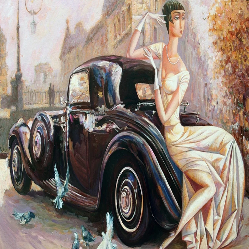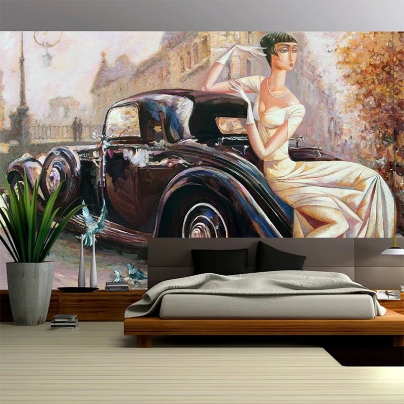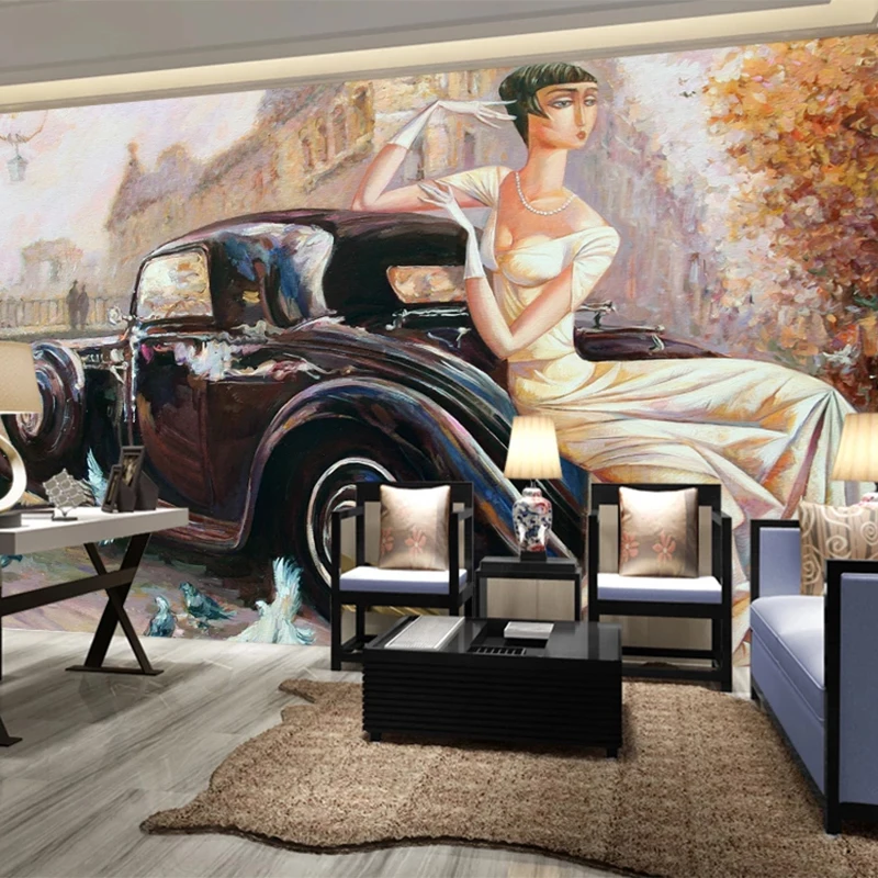 Пользовательские самоклеющиеся обои 3D Винтаж классический автомобиль Красивая Женская картина маслом фото фрески гостиная спальня настенная наклейка
