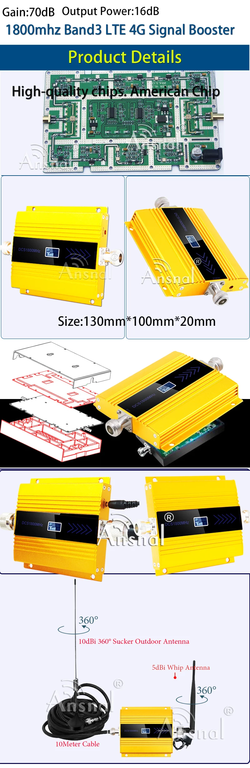 ❶ WCDMA2100Mhz 3G Частотный диапазон:Диапазон частот (LTE Band1 2100 3G ): UL:1920 ~ 1980 МГц; DL:2110 ~ 2170 МГц;② Диапазон частот (DCS1800): UL:1710 ~ 1785 МГц; DL:1805 ~ 1880 МГц;③ Диапазон частот (GSM900Mhz 2G):(загрузка: 890 ~ 915mhz, загрузка 935 ~ 960mhz)-Цвет: серый и золотой;-Усиление: вверх 65 ± 3 дБ; Вниз 70 ± 3 дБ-Сопротивление: 50 Ом-Изоляция: >70 дБ-Максимальная выходная мощность: + 20dbm-Тип разъема: N-Female-Рабочая температура: -10 ~ 55 градусов-Мощность: Ac 110/220v Dc 5v,1A-Размер повторителя: 210*170*20 мм-Вес повторителя: 0,45 кг---------------- Улучшите свой мобильный сигнал. Больше никакого плохого приема. Больше никаких звонков.-Расширьте охват сигнала, когда сигнал слаб. Подходит для дома и офиса.-Diy проще для установки. Вам просто нужно подключить провода, которые у вас есть.-Каждая внутренняя антенна может покрывать около 500 квадратных метров (открытое пространство). Каждый повторитель может установить до 3 внутренних антенн.-Поддержка всех голосовых систем мобильного оператора + Sms + Синхронизация данных