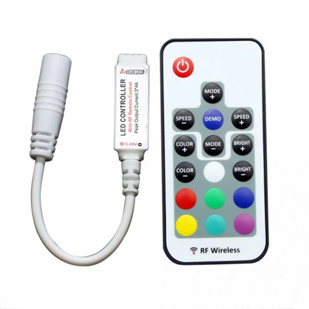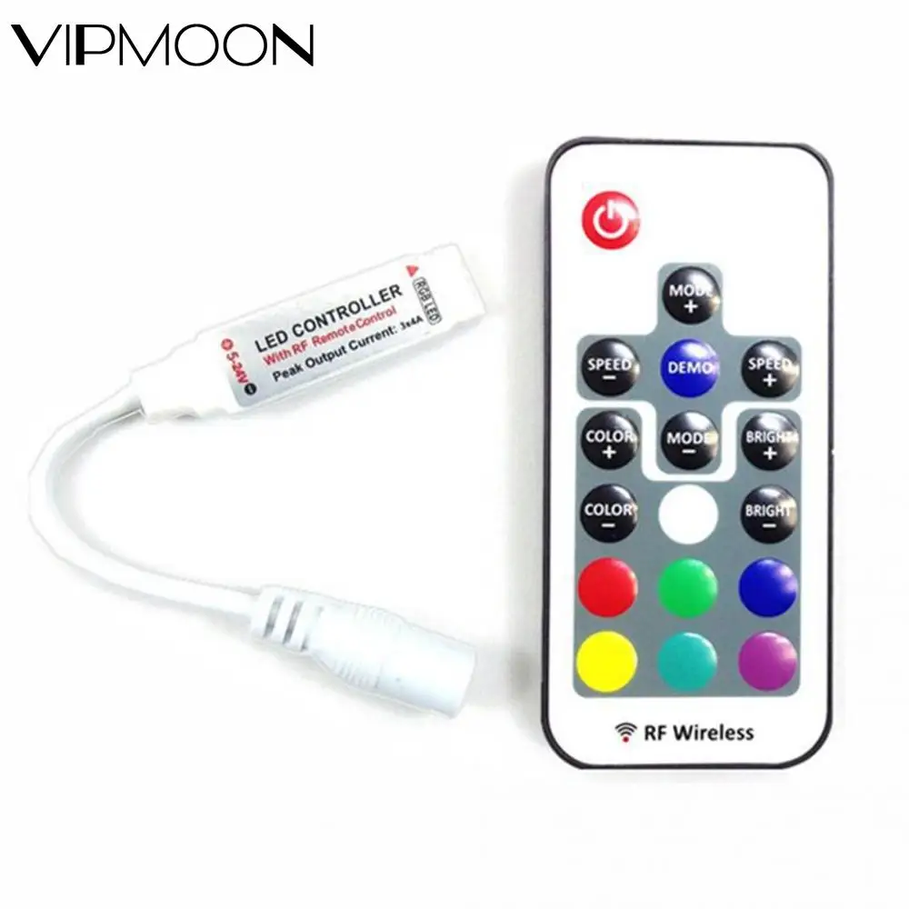 Особенности:Это светодиодный мини RGB контроллер в сочетании с 17-кнопка RF контроллер.Вам будет удобнее управлять полосками, так как мини-контроллер легко скрывается, и радиочастотный Контролер может пройти через battier и получить большое расстояние управления линзами и управление линзами радиус действия, так как при эксплуатации не требуется настраивать на Главный блок.Характеристики:Напряжение: 5V-24VУправление RGB: 3 выхода канала, общий анодРабочая температура: -20 градусов C ~ 60 градусов CТип батареи: CR2025Размер: L1.6 ''x W0.5'' x H0.2''Посылка включает в себя:1 x Мини-пульт дистанционного управления с 17 кнопкамиО радиочастотном Rremote:20 статических цветов, 9 динамических режимов, 5 уровней для скоростиВкл/Режим ожидания: Включение или переключение в режим ожиданияРежим +/режим-: Переключение в динамический режим из режима статического освещения или переключение между динамическими режимамиСкорость +/скорость-: регулировка скорости освещения в динамическом режимеЯркий +/яркий-: Регулировка яркости режима освещенияЦвет +/цвет-: статическая Регулировка цвета. Переключение на статический цвет из динамического режима или между статическими цветамиДемонстрация: в демонстрационном режиме полоса будет использовать 9 динамических режимов и каждый режим 3 разаВыбор одного цвета: белый/красный/зеленый/синий/желтый/ching/розовыйВнимание: Радиочастотный пульт управляется батареей с кнопками 3 в CR2025, пожалуйста, попробуйте заменить батарею того же типа.