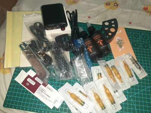 Комплектация с картинки , все работает. В наборе по 5 штук игл для контура и закраса, плюс одна единичка. Чернила только для тренировки, кожу лучше взять другую, тк эта вообще не подходит для тренировок. Сама ручка достаточно лёгкая , шумит не громко, все остальное тоже все самое простое. В общем отличный кит для тренировок. На фото с картриджем видно как крошится тренировочный коврик , такого быть не должно. Кстати на каждом картридже есть срок годности , тоже видно на фото.