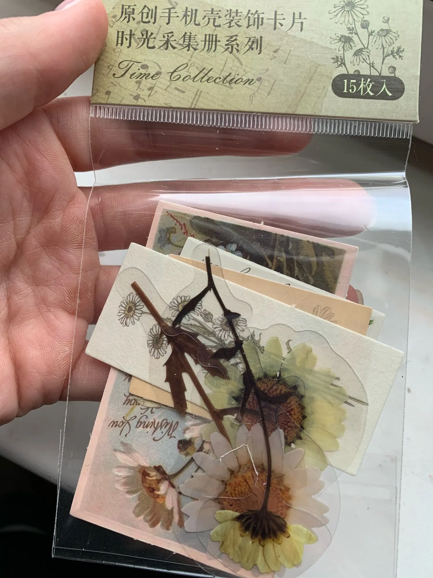 пришел где-то за месяц, это НЕ наклейки! все красивое, качественное. цветы из пластика (?), остальное все просто плотная бумага. некоторые картинки на крафтовой бумаге, но большая часть на глянцевой. товаром довольна, все прекрасно) p.s на фотографиях наложен фильтр, в жизни они не такие яркие.