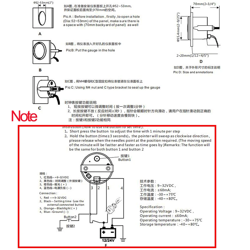 Подключение: 1. Красный-+ 9-32 В постоянного тока 2. Черный-настройка времени (Используйте Внешняя подключенная Кнопка 3, оранжевый-черный свет (+) 4. Синий-Земля ( - ) Красный подключен к положительному полюсу, при неправильном подключении он легко выгорает, обратите внимание при подключении Пожалуйста, проверьте наши инструкции перед установкой, иначе счетчик будет сломан.