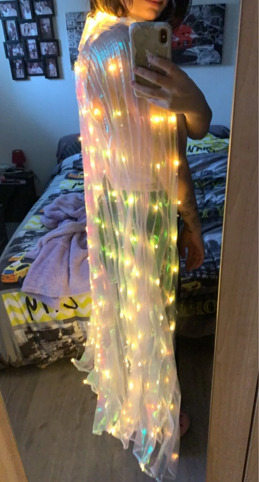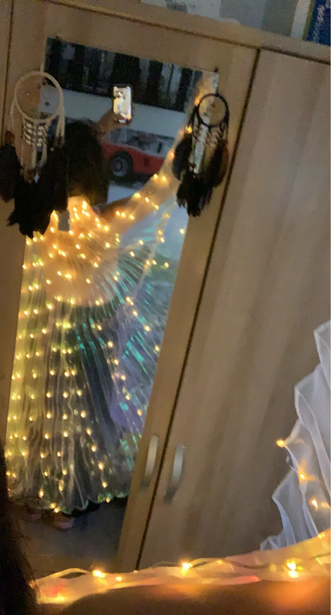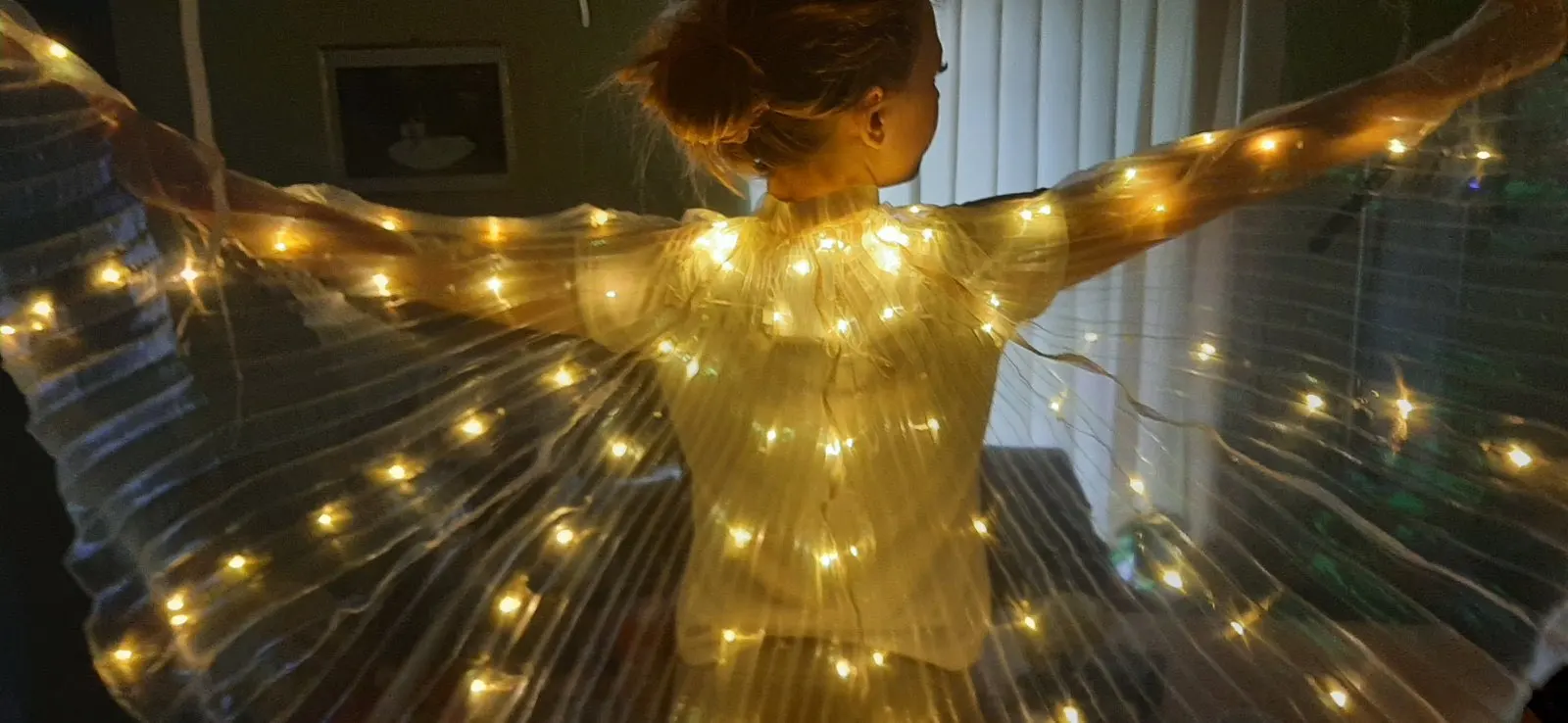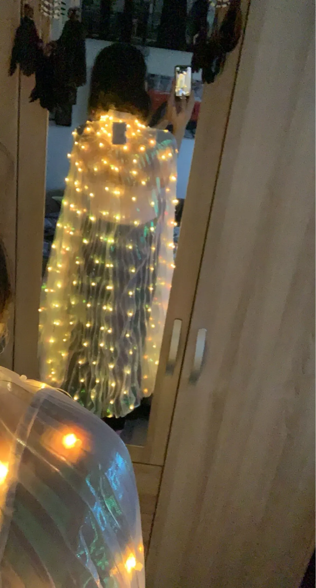 Крылья со светодиодом встроены в крылья! Я люблю ждать, чтобы увидеть, что это даст в темноте, и при съемке я измеряю 1m47, и я взял детский размер, он идеально подходит, и палочки регулируемые, это здорово, я рекомендую! Я выбрал желтый цвет