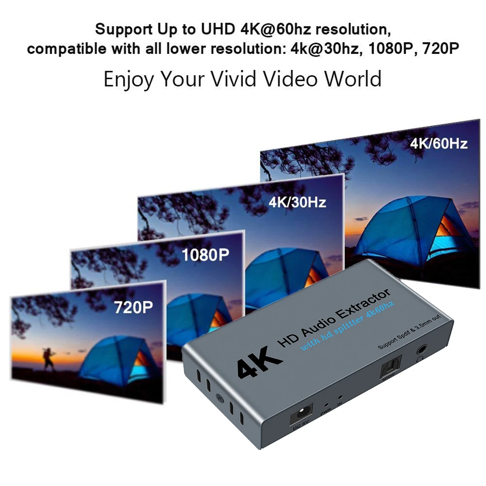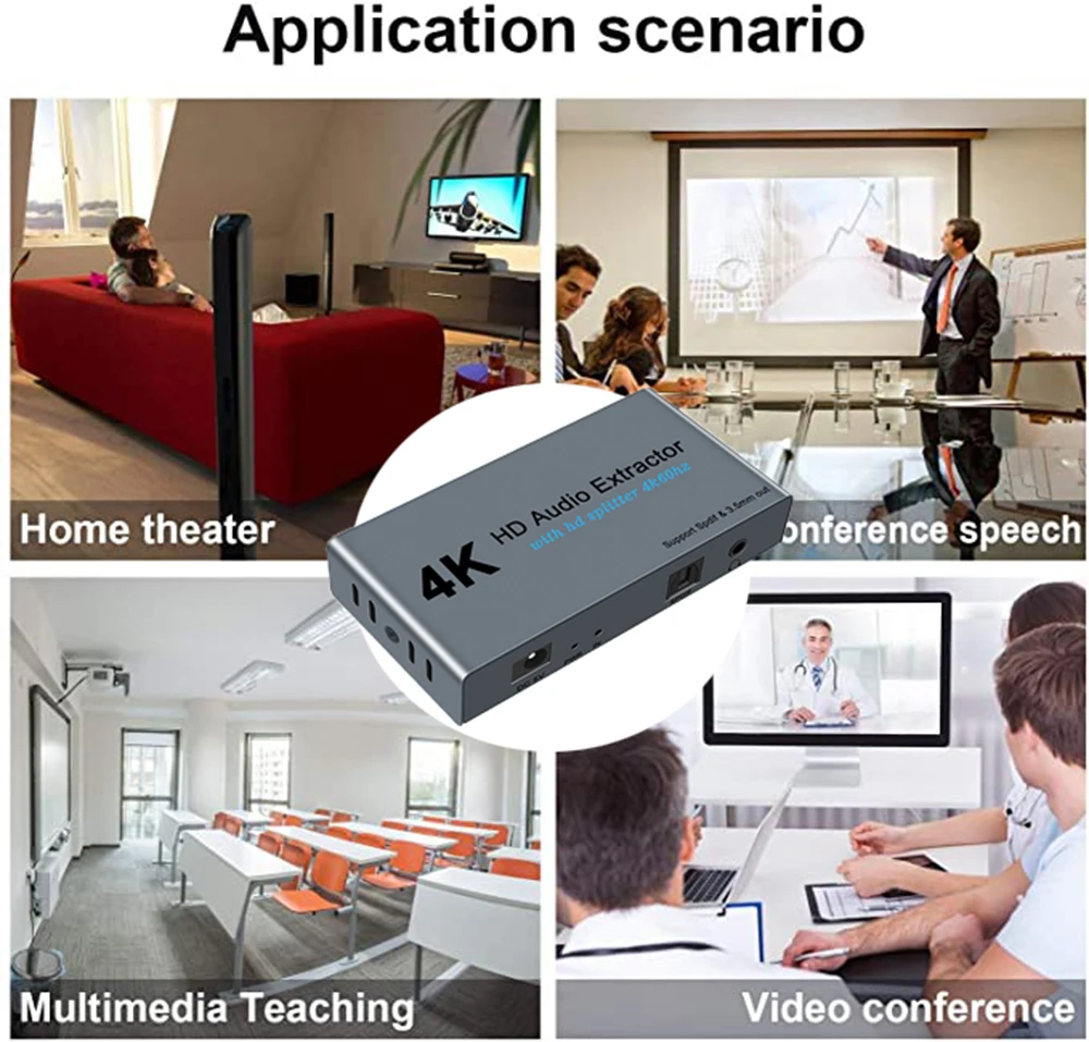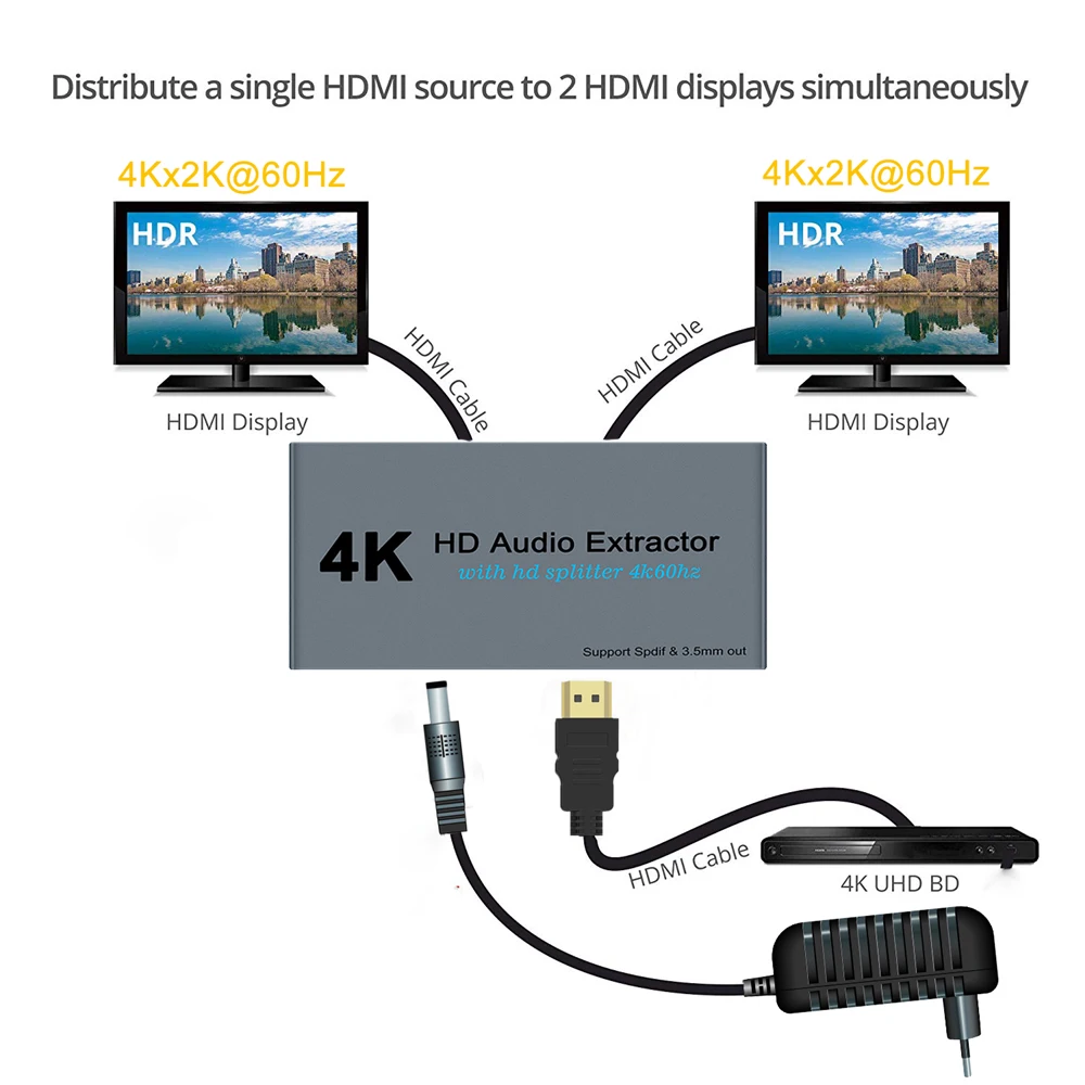 HDMI аудио экстрактор может поддерживать 3D \ 4KX2K и он позволяет 1 HDMI вход и 2 HDMI выход, подключенный к 1 HD дисплею.