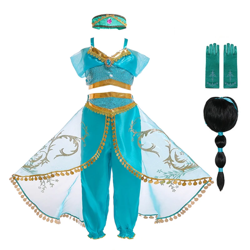 Рождественское платье Аладдина для девочек на вечерние эллоуин, костюм для косплея жасмина с париком, волосами и шляпой, платье для косплея жасмина для девочек
