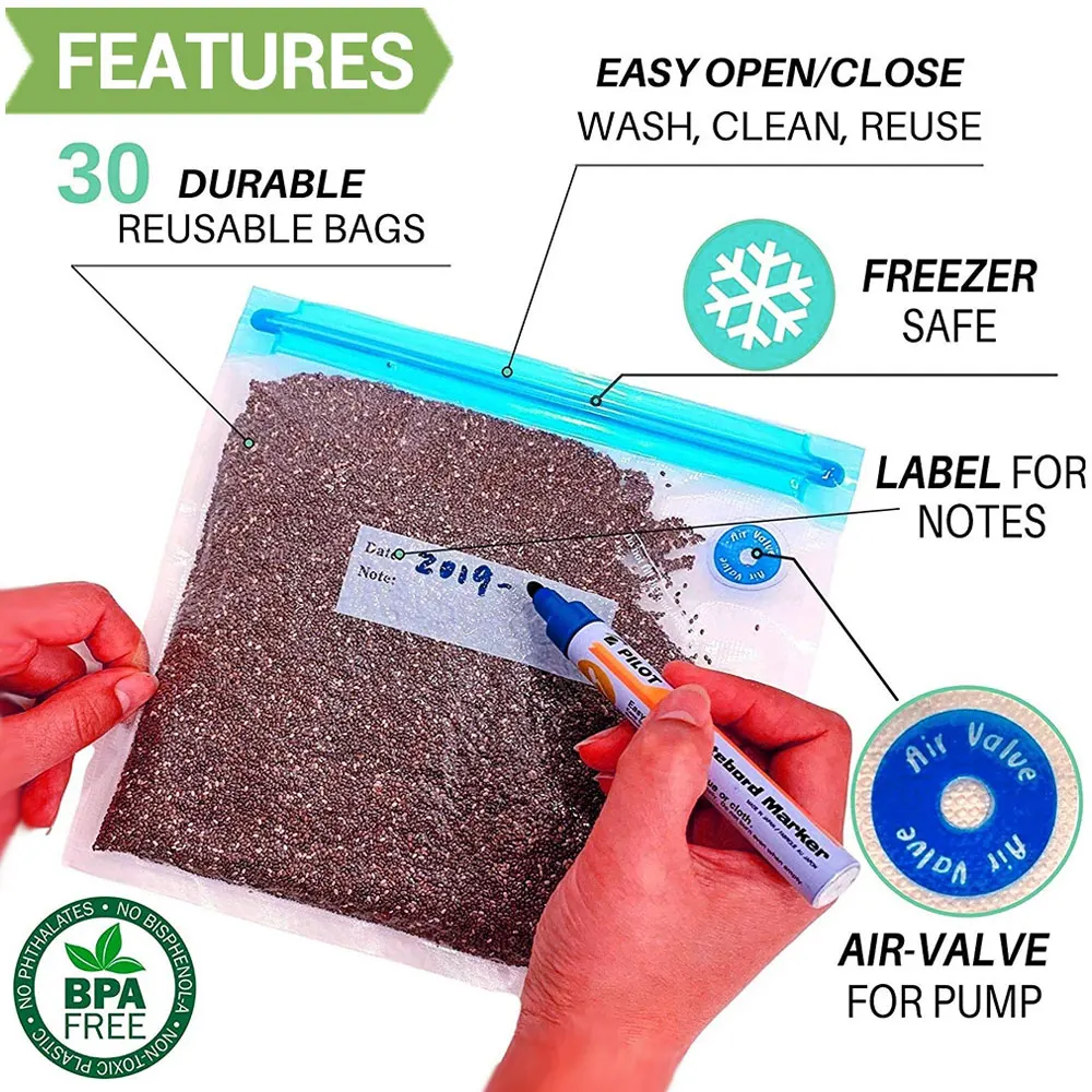 1. Многоцелевой: многоразовый пакет для хранения идеально подходит для отверждения мяса, еды, замороженных продуктов, злаков, печенья, канцелярских принадлежностей, детских игрушек и тканых материалов.