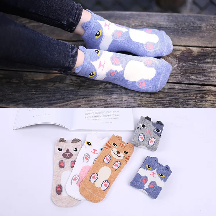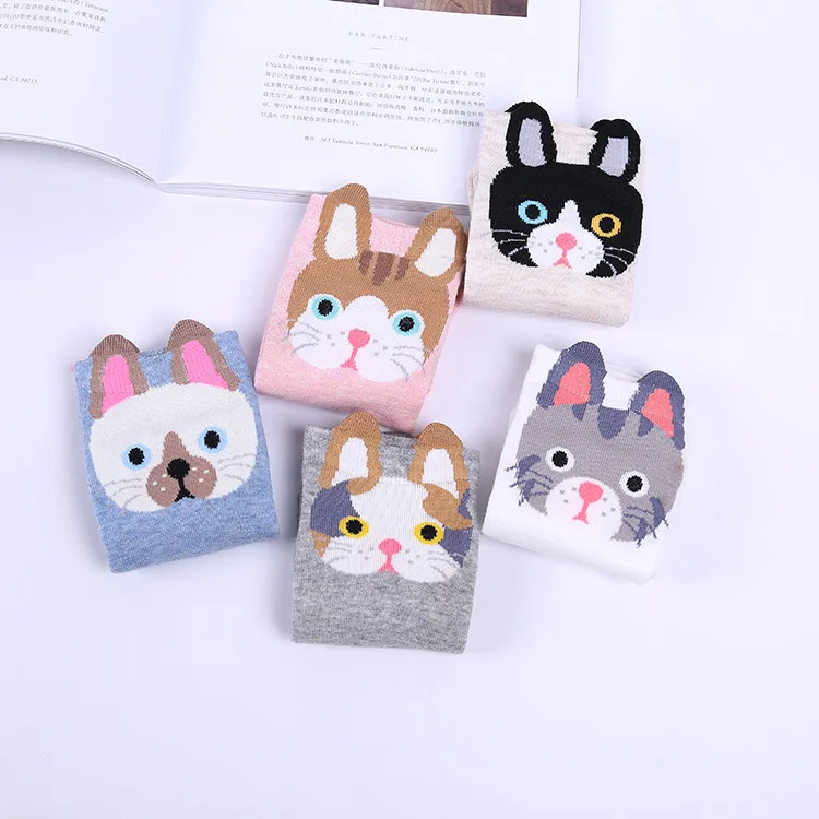 Носки женские хлопковые в стиле Харадзюку, комплект из 5 пар, с 3d-ушками симпатичного мультяшного торта, котенка, до щиколотки, лето-зима