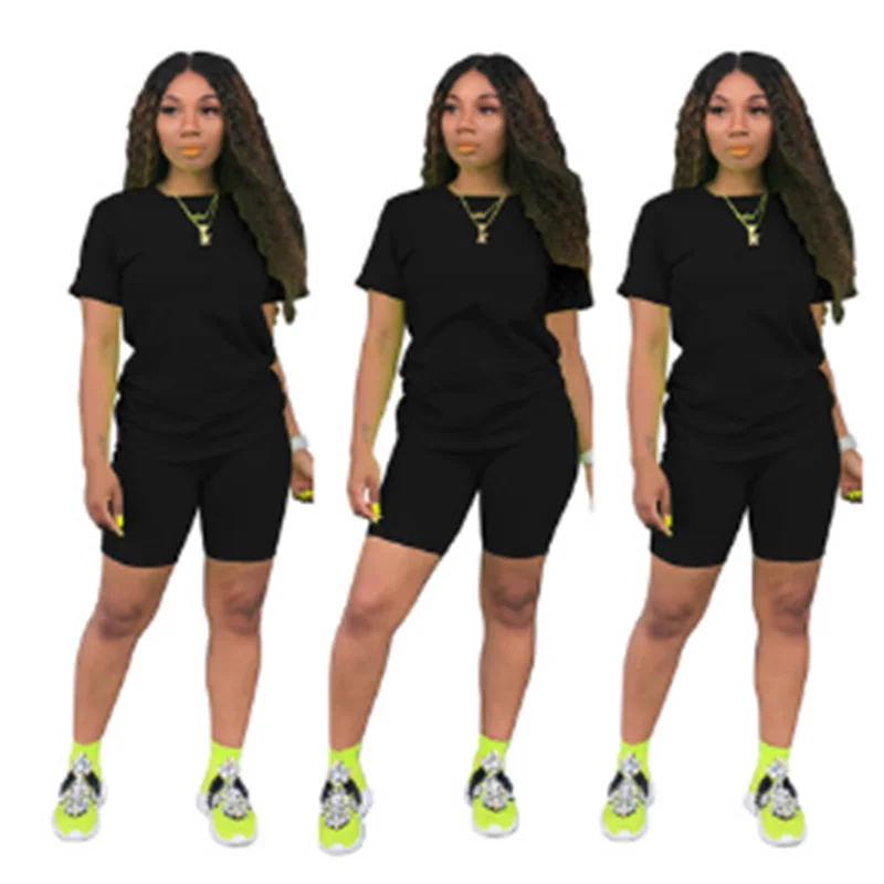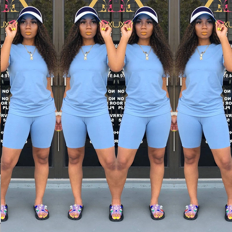 Однотонная одежда из двух предметов, футболка с круглым вырезом и облегающие шорты, простой стиль, женский спортивный костюм, распродажа