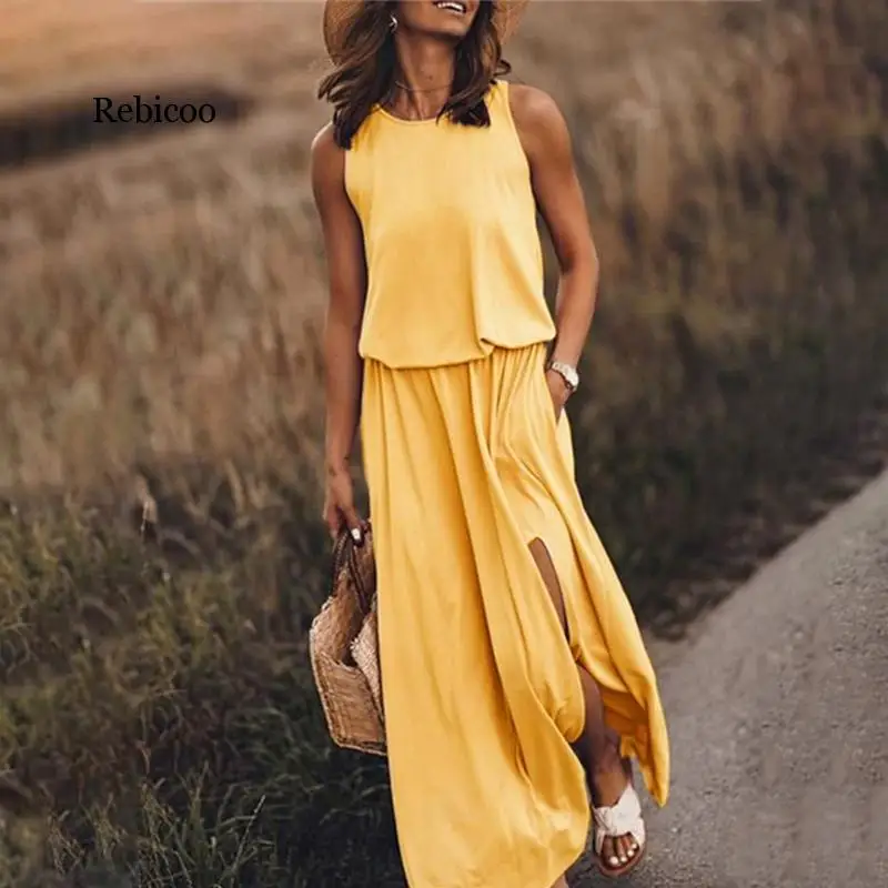 Женское свободное платье макси, с разрезом, с эластичной талией, без рукавов, весна-лето, размера плюс