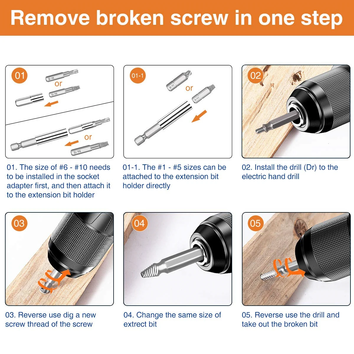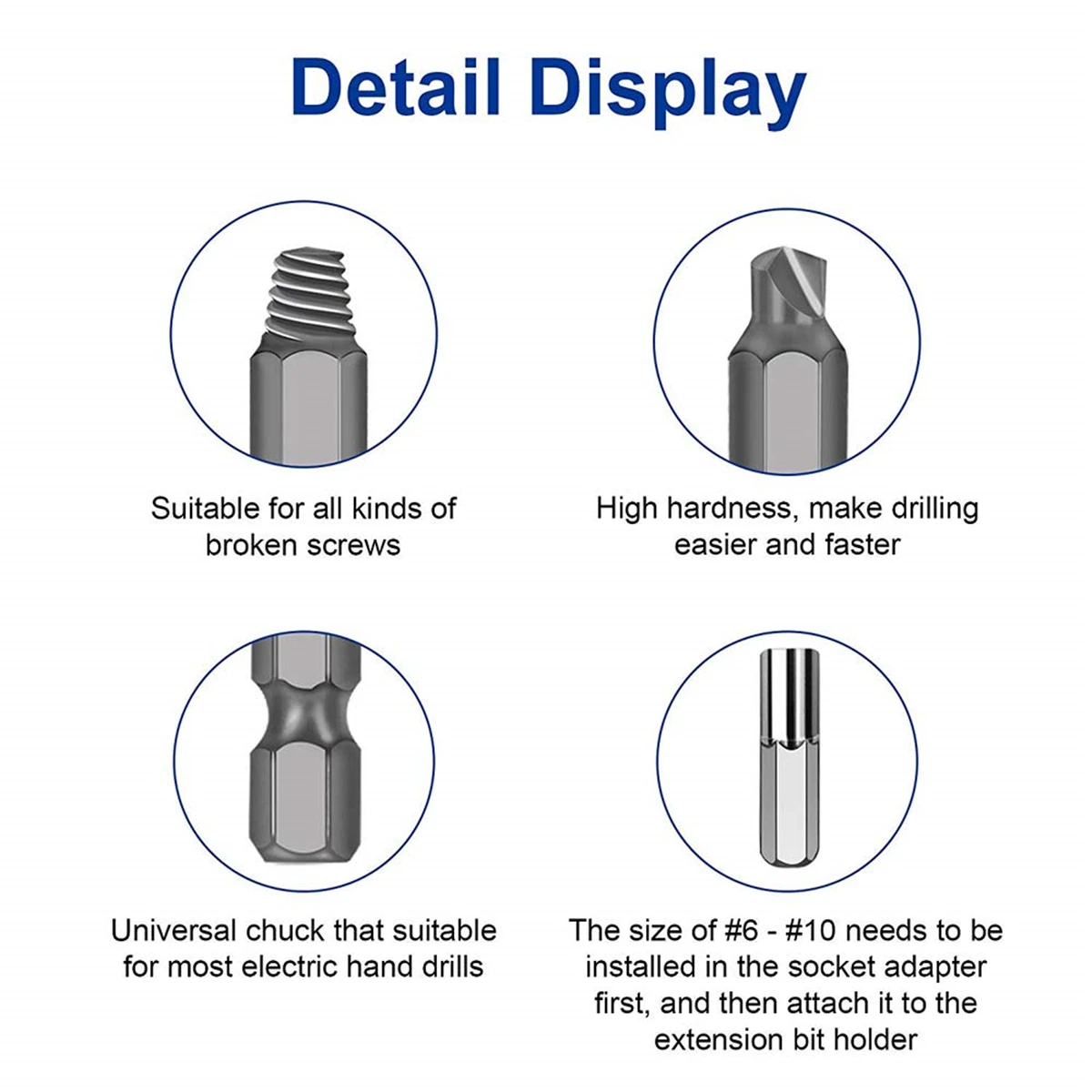 Параметры: Материал: высокоскоростная стальная 4241 Размер: #1, #2, #3, #4, #5, #6, #7, #8, #9, #10 Подходит для общих размеров и всех видов сломанных бит Универсальный патрон, который подходит для большинства электрических ручных дрелей Удалите сломанный винт в один шаг Особенности: 1. Винтовой экстрактор изготовлен из высококачественной высокоскоростной стальной 4241. Высокая твердость, прочный и легко удаляет поврежденные винты. 2. Комплект экстрактора с зачищенным винтом включает два держателя для удлинителя. Можно удалить за один шаг, не нужно преобразовывать экстрактор или регулировать патрон. 3. Комплект экстрактора с зачищенными винтами включает в себя 20 штук экстрактора с зачищенными винтами в 10 различных размерах, чтобы удовлетворить все ваши требования. Подходит для любого размера винта или болта. 4. Подходит для шестигранных болтов, машинных винтов, лаговых болтов, деревянных винтов, шестигранных болтов, винтов из листового металла и других винтов. 5. Лучше всего использовать электрическое ручное сверло, нельзя использовать режим сверления молотка! Должна быть низкая скорость во время использования. Как использовать винтовой экстрактор? 1. Размер #6 - #10 должен быть установлен в гнездо адаптера, А затем Прикрепите его к удлинительному держателю (другие размеры можно прикрепить непосредственно к удлинительному держателю). 2. Используйте сверло (Dr) для сверления отверстия в сломанных винтах. 3. Изменить, чтобы использовать экстракт (Ex) бит с тем же размером. 4. Используйте сверло с обратной стороны и выньте сломанный бит. Полезные советы: 1. Необходимо сначала просверлить отверстие, когда поверхность разрывного винта гладкая. В противном случае Сверло будет скользить. 2. При сверлении необходимо иметь вертикальную и низкую скорость, при обратном использовании этот бит сверлить первое отверстие глубже будет легче вынуть. 3. Лучше всего использовать электрическое ручное сверло, нельзя использовать режим сверления молотка! Должна быть низкая скорость во время использования. Посылка включает в себя: 20 х поврежденных винтовых экстракторов Магнитный удлинитель-держатель-1 шт. 1 х разъем адаптера Более подробной информации: