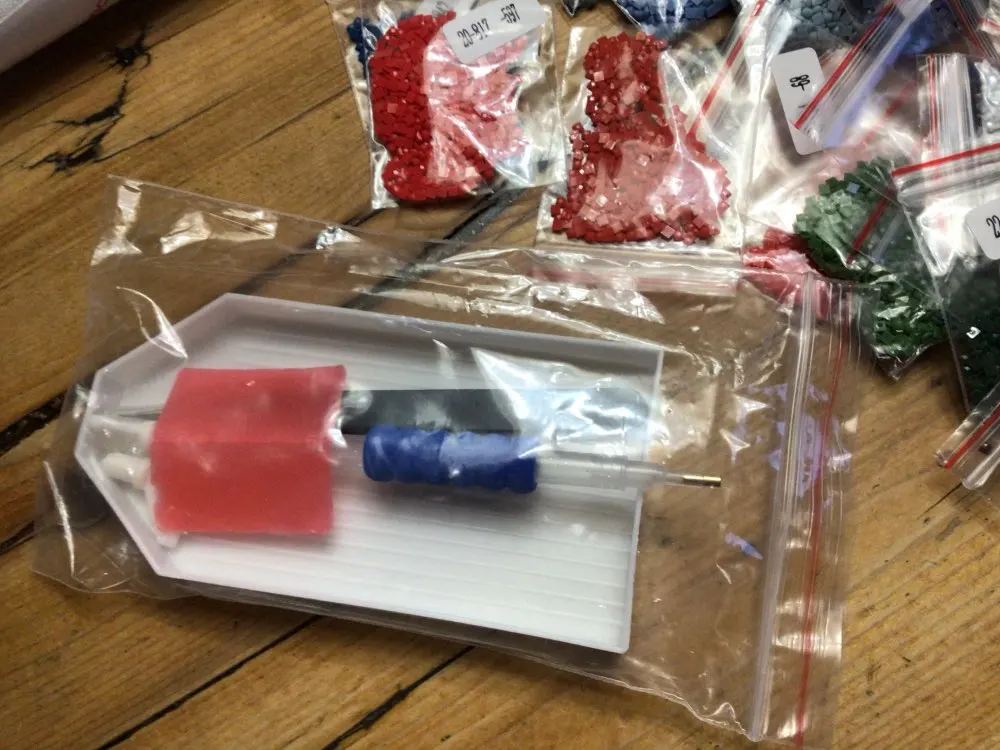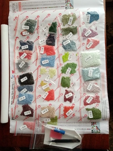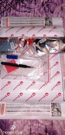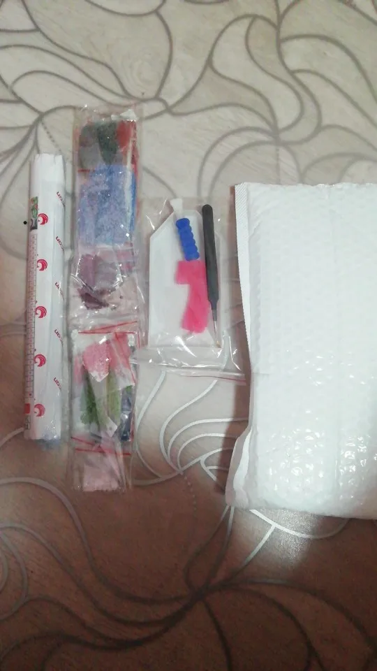 Заказ объединили с другим моим заказом, доставка - месяц. Упакована картина хорошо. намотана на валик. Размер соответствует заявленному. В наборе инструментов присутствуют тоненькие щипчики, удобный инструмент для выкладки, большой лоток. но неудобно из него высыпать стразы.