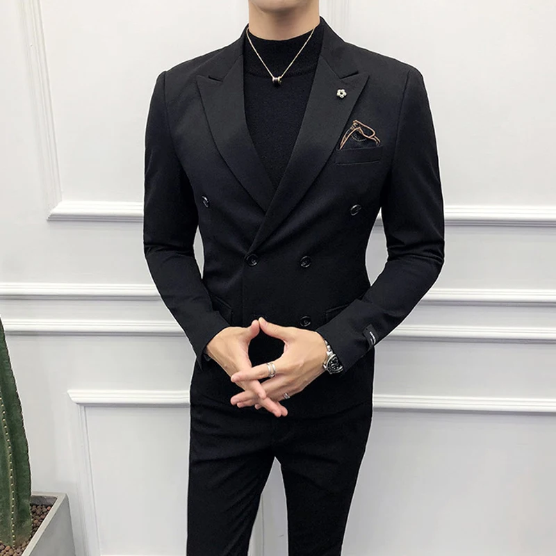 Мужские костюмы бойфренда с двойным рядом пуговиц, 2 предмета, облегающие смокинги для жениха на заказ, модная мужская одежда с заостренным лацканом