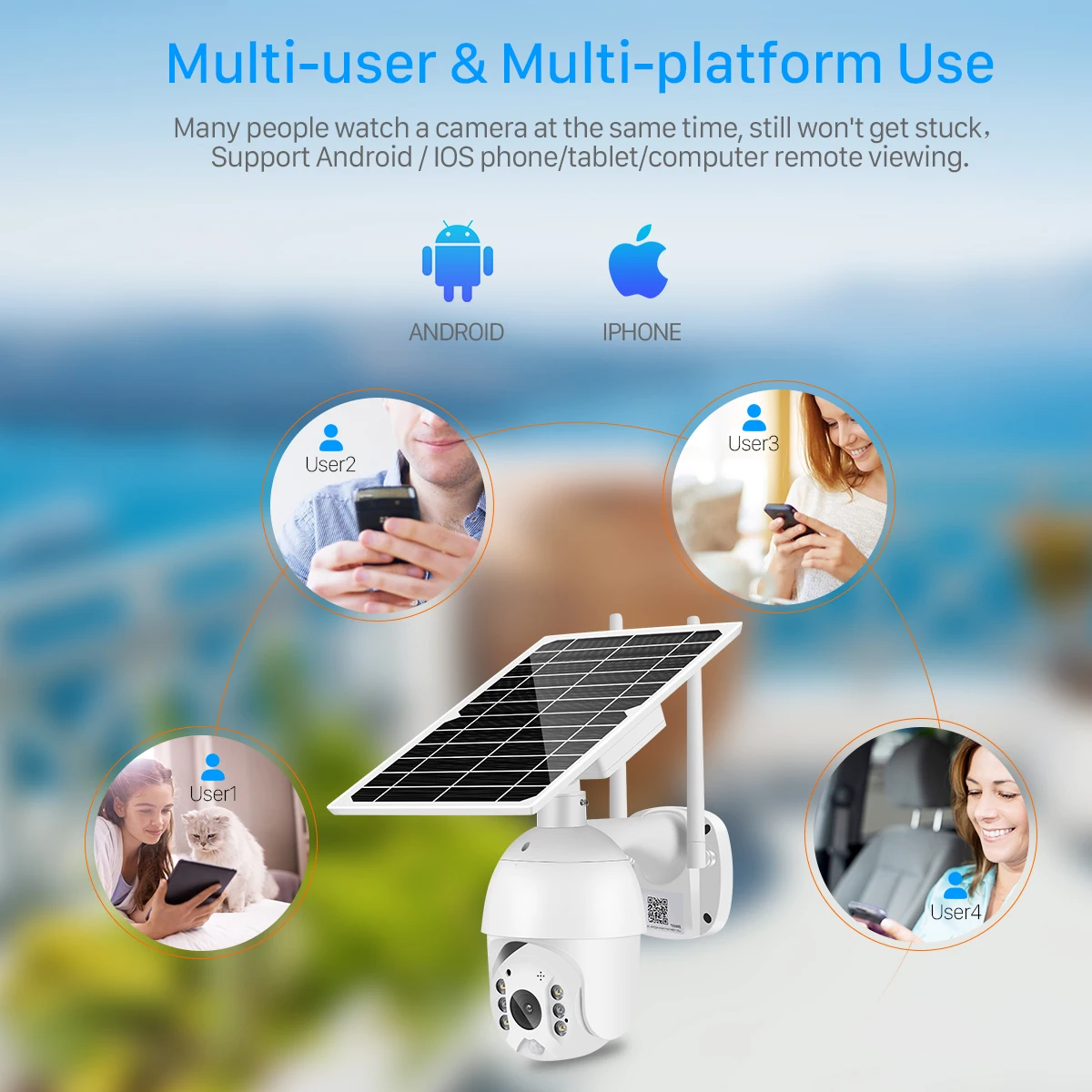 100% провода бесплатно и легко установить; Отсканируйте qr-код для подключения камеры безопасности к вашему телефону через бесплатное приложение; Бесконтактный Солнечный источник питания с собственной солнечной панелью и батарейным блоком