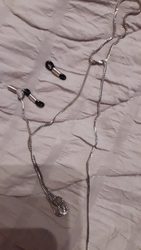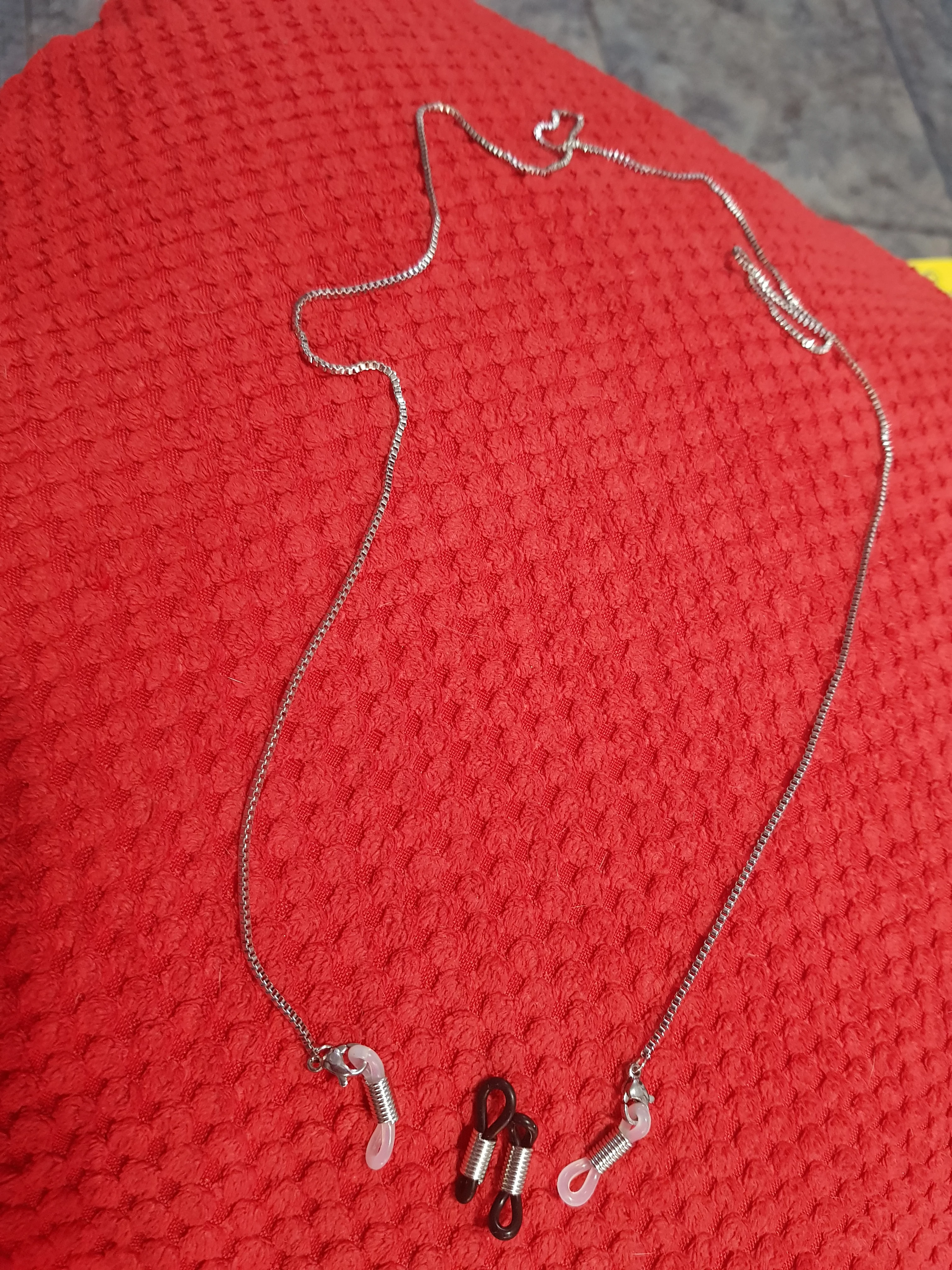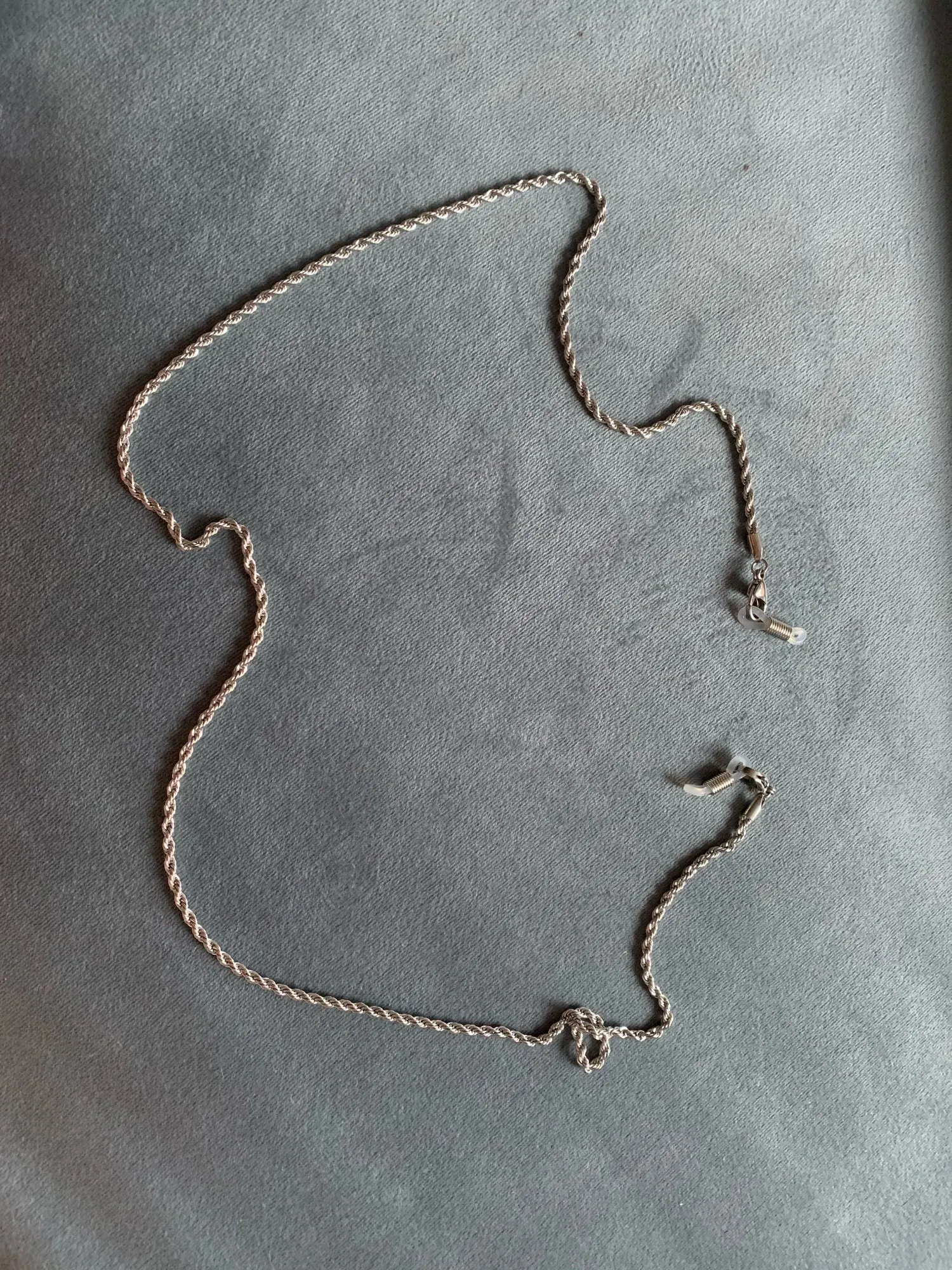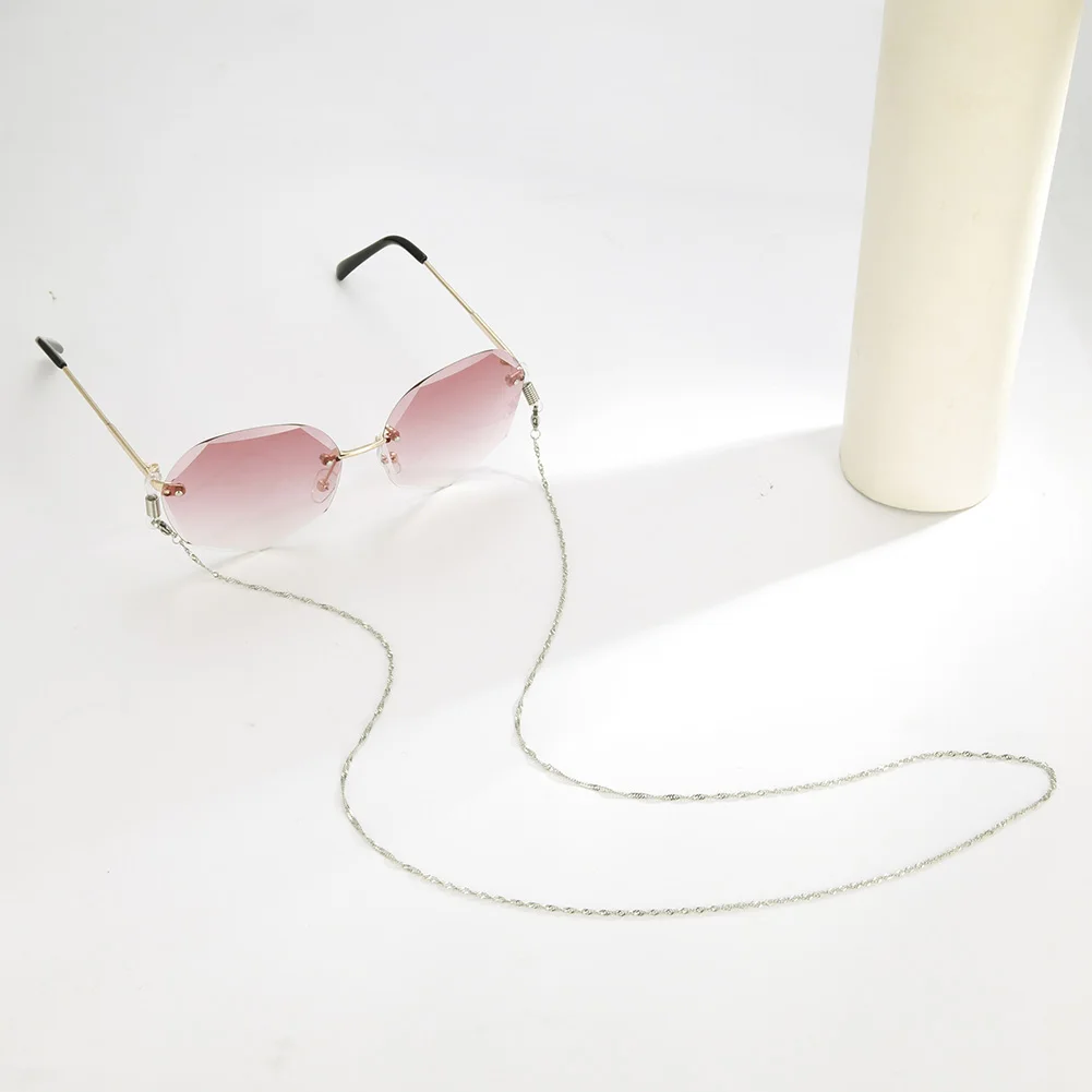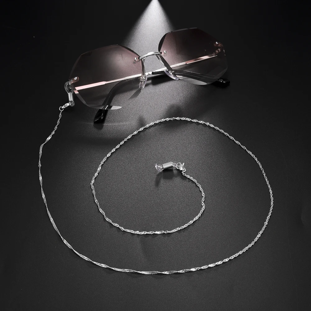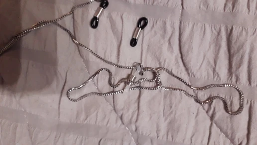серебряная цепочка мелкая, почти не видна,когда одеваешь на очки, и мягкая ,лежит хорошо