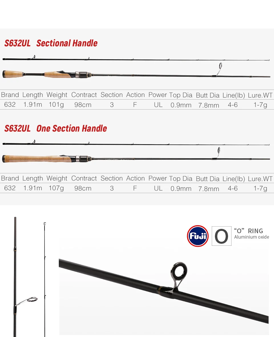 Характеристики продукта: Оснащен направляющими кольцами FUJI, легкая чувствительность Оснащен верхним кольцом FUJI с защитой от закручивания. Конструкция с защитой от бокового ветра и нелегко обернуть леску Катушкодержатель FUJI VSS обеспечивает надежную платформу для всех катушек Одна секционная ручка и секционная ручка два дизайна Португальская пробковая рукоятка эргономичного дизайна может эффективно снять усталость, вызванную долгой рыбалкой 3 секции конструкции, наконечник стержня сплошной дизайн более гибкий, может чувствительно реагировать на любые изменения Сведения о продукте: Модель: 632ULS Длина: 1,91 м Длина сжатия: 98 см Мощность: UL Действие: F Верхний диаметр: 0,9 мм Диаметр Днища: 7,8 мм Вес приманки: 1-7 г Линия: 4-6 фунтов
