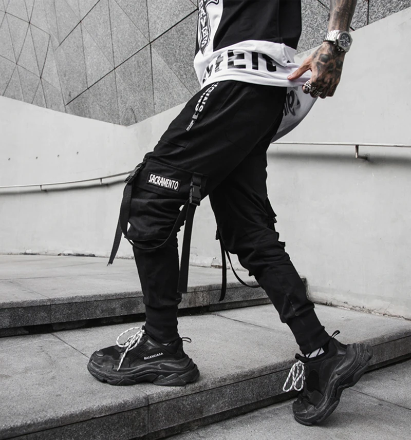 Новые весенние штаны для бега в стиле хип-хоп, мужские свободные черные штаны-шаровары с несколькими карманами и лентами, повседневные уличные спортивные штаны для мужчин