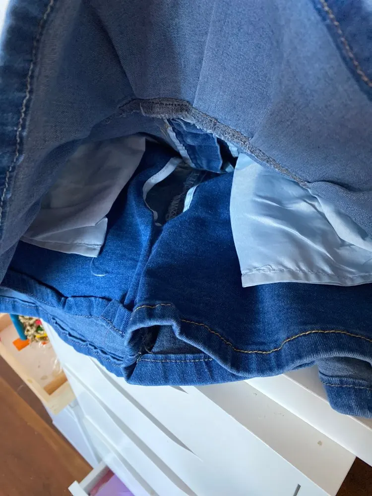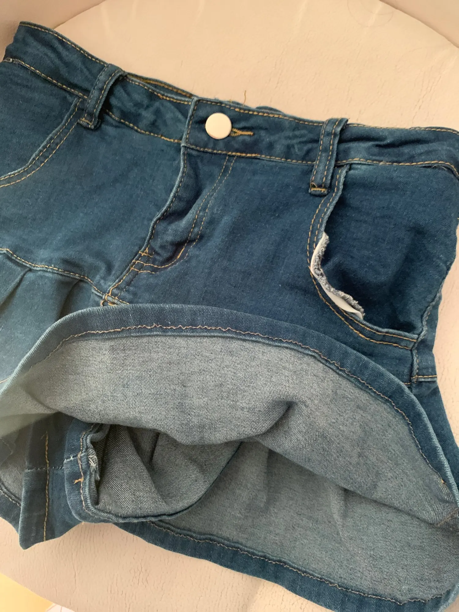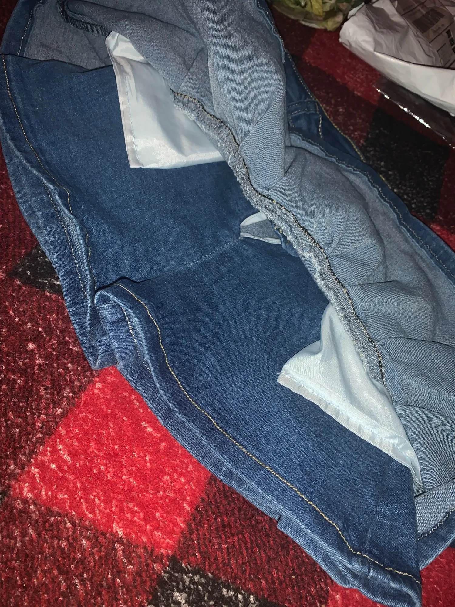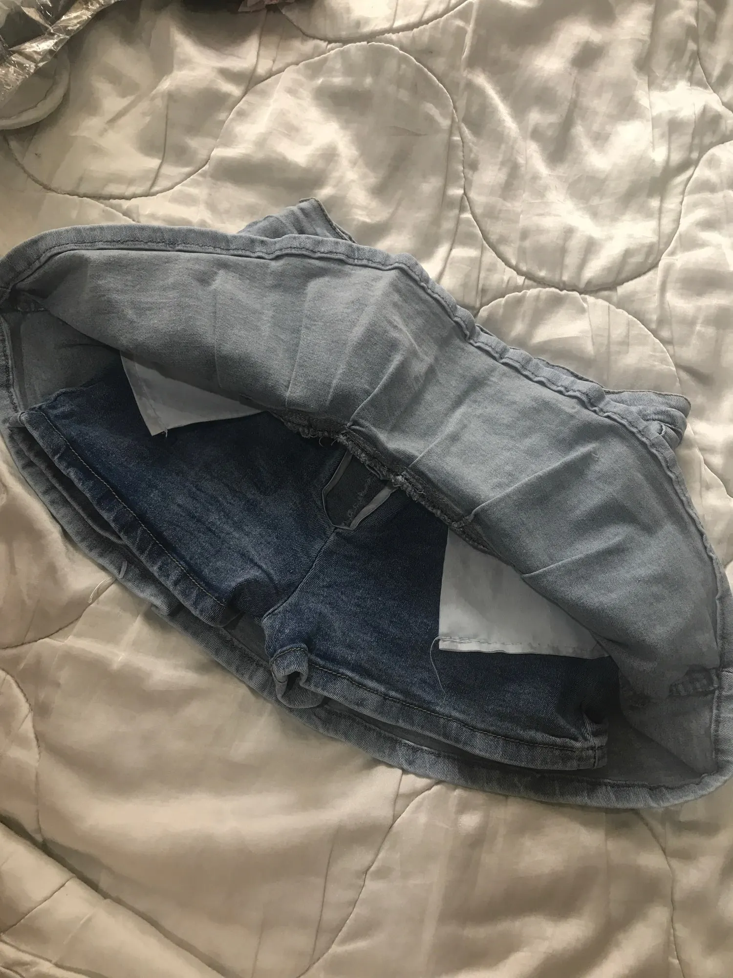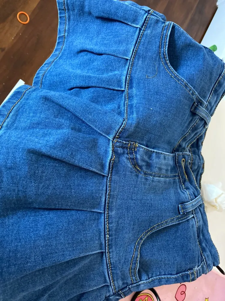 It’s so cute it kinda fit weird in the back, like there was this gap but it could just be my body shape. it’s denim and the fabric is kinda stretchy. It’s also super short to be honest but it comes with shorts. It’s a little high waisted, it ended at the middle of my belly button. The button is super flimsy and the slit for the button is small but you could just cut it open more. For reference I’m 5’6 120 pounds 27” waist and 35” hips