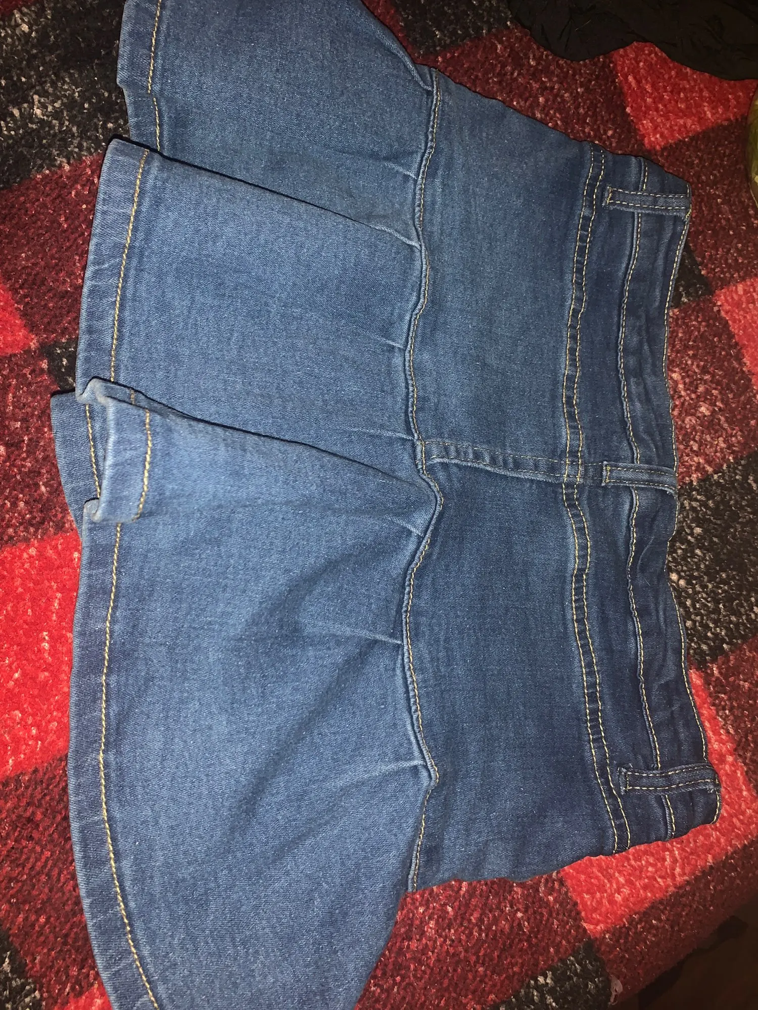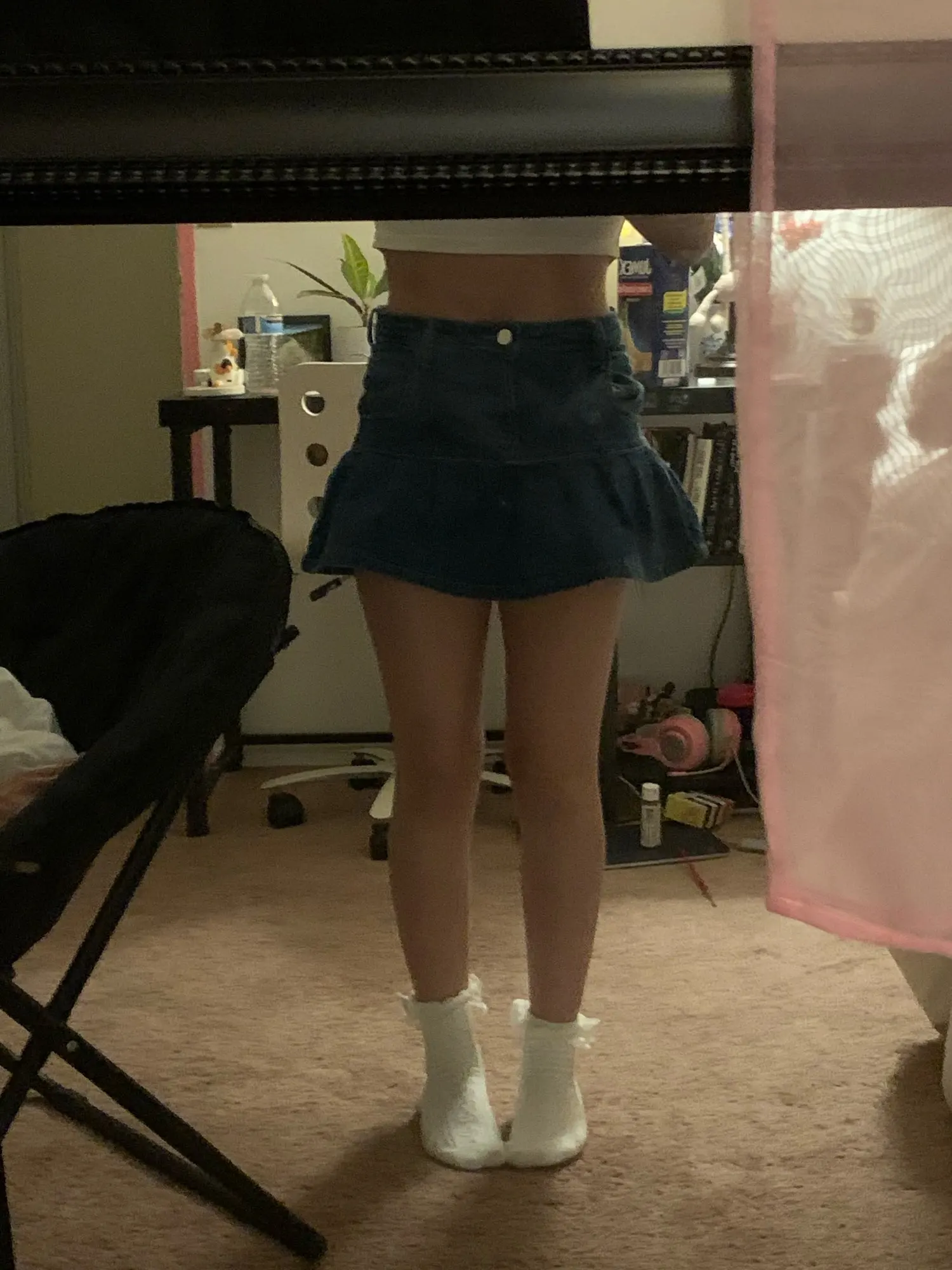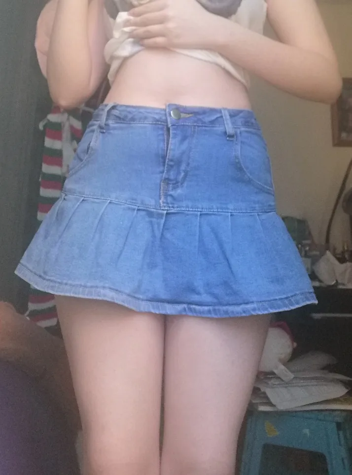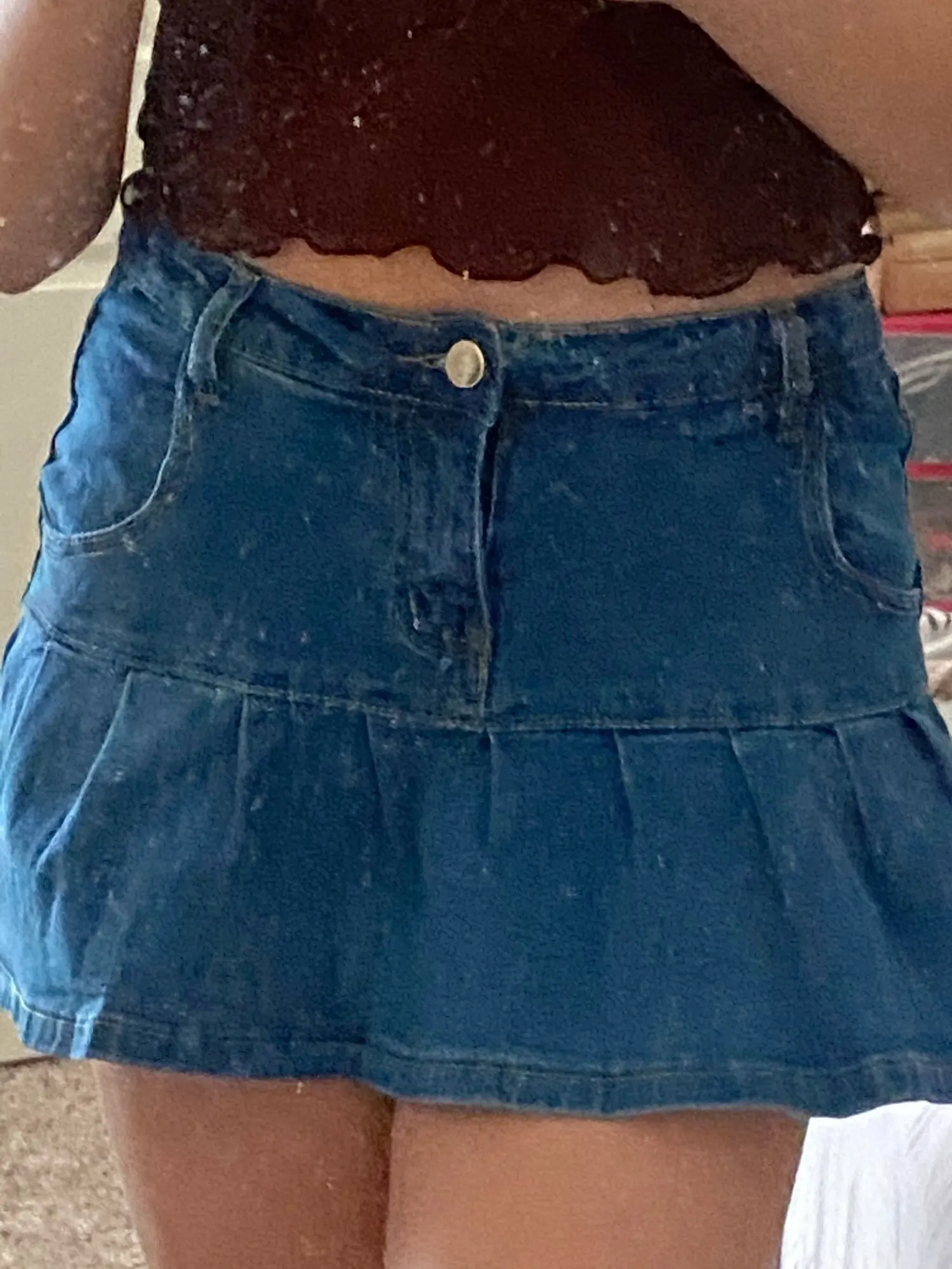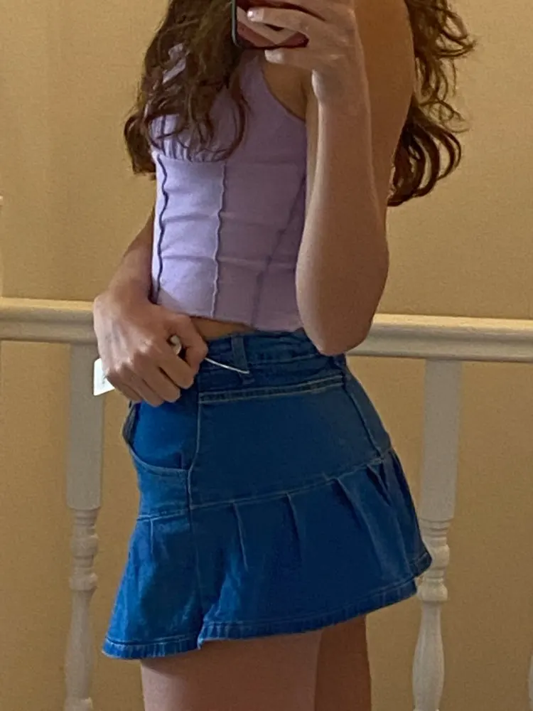 It’s so cute it kinda fit weird in the back, like there was this gap but it could just be my body shape. it’s denim and the fabric is kinda stretchy. It’s also super short to be honest but it comes with shorts. It’s a little high waisted, it ended at the middle of my belly button. The button is super flimsy and the slit for the button is small but you could just cut it open more. For reference I’m 5’6 120 pounds 27” waist and 35” hips