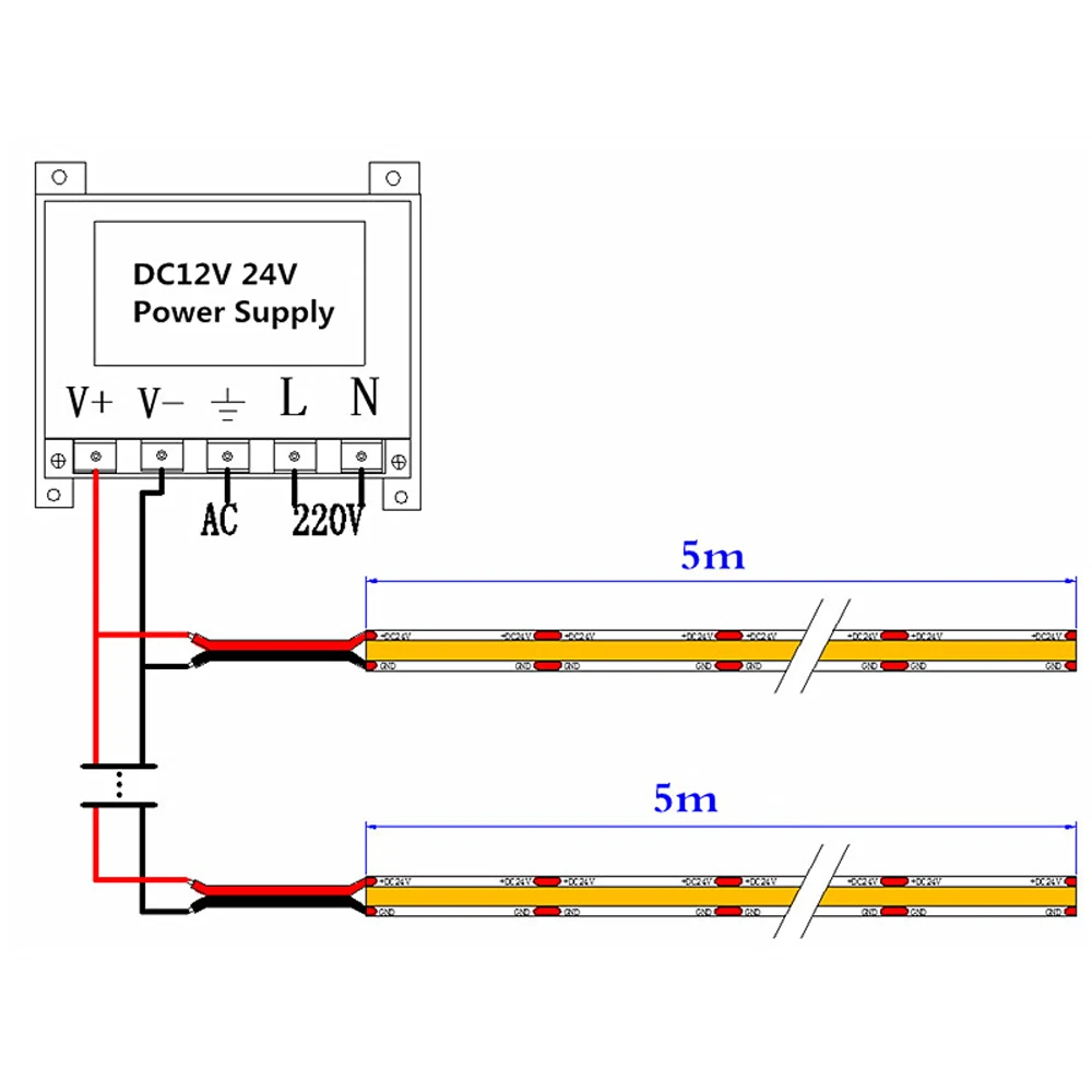 4. Если Светодиодная лента подключена более 5 метров, может быть падение напряжения, что приводит к тому, что светильник будет непоследовательным. Пожалуйста, добавьте напряжение каждые 5 метров.