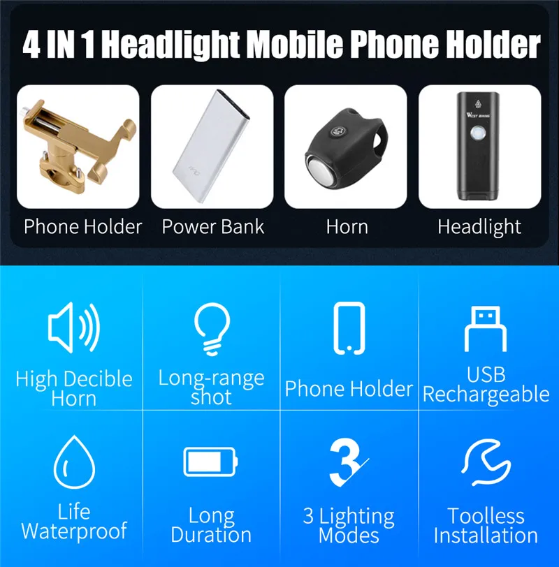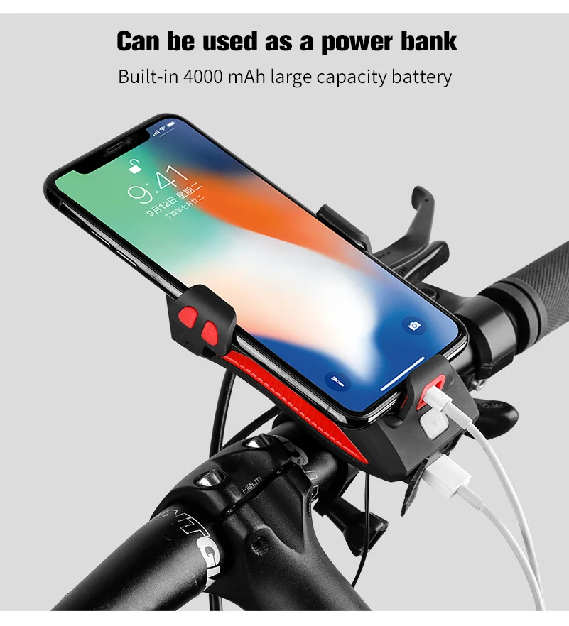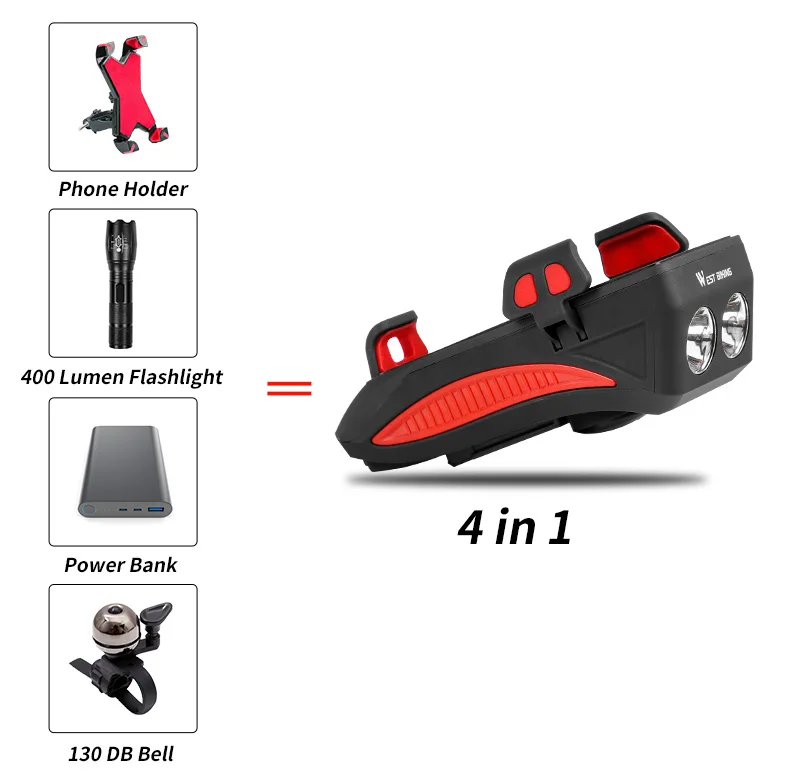 WEST BIKING, многофункциональный, 4 в 1, велосипедный светильник, 400 люменов, велосипедный флэш-светильник, велосипедный рожок, держатель для телефона, внешний аккумулятор, велосипедный передний светильник