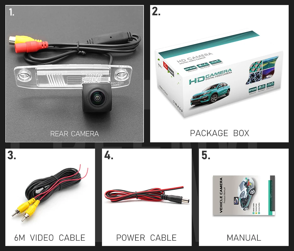 1. Задняя камера2 посылка3. Видеокабель (6 м)4. Кабель питания5. Руководство