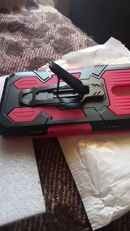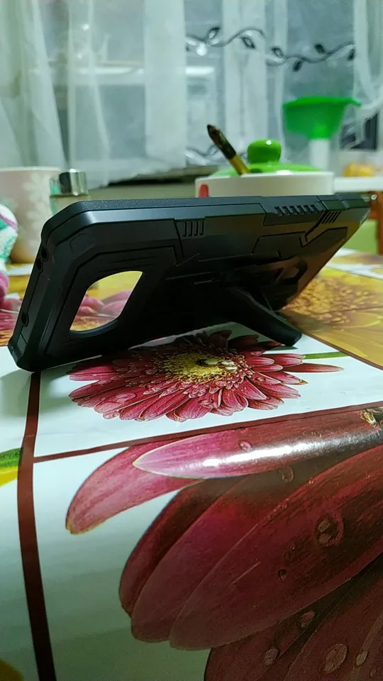 Чехол пришёл. Как на фотографиях. Подножка и фиксатор на ремень хлипенькие и тонкие. В руке телефон сидит гораздо лучше, чем скользкий силикон.