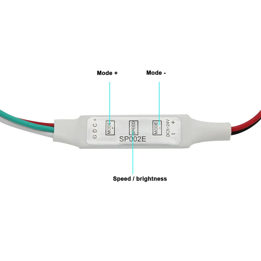 Особенности: 1. Работает стабильно, прост в использовании и легко соединяется; 2. Может быть настроен для поддержки почти всех видов одного провода или двух проводов LED-DRIVER-IC; 3. С 68 видами узоров, которые яркие и красивые; 4. Может управлять до 2048 пикселей; Перед источником питания проверьте, соответствует ли рабочее напряжение контроллеру, чтобы гарантировать отсутствие короткого замыкания между кабелем. Микроконтроллер имеет три кнопки. Статус питания по умолчанию: ходовая вода, общий переход, метеор, одна точка, красочные градиенты, движущиеся вперед шесть состояний после езды на велосипеде, ставка по умолчанию. Технические характеристики: Операционной Напряжение: DC5V-24V Потребляемая мощность: менее 1 Вт. Функции клавиш: режим +: Переключение шаблонов Скорость: скорость переключения Режим-: Переключение узоров сзади Режим + и режим-: нажатие РЕЖИМ + и режим-в то же время и отпустите одновременно в автоматический режим Область применения: Применяется к WS2811 Pixel RGB SMD5050 светодиодной ленты/модуля/лампы Посылка включает в себя: 1 мини светодиодный контроллер