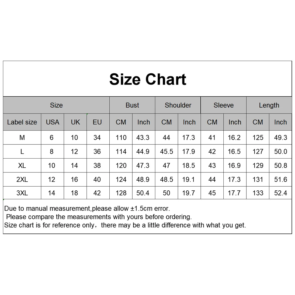 Размеры: [Наш Размер M] Бюст: 110 см/43,3 дюйма, Плечи: 44 см/17,3 дюйма, рукав: 41 см/16,1 дюйма, длина: 125 см/49,2 дюйма (прибл.) [Наш Размер L] Бюст: 114 см/44,9 дюйма, Плечи: 45,5 см/17,9 дюйма, рукав: 42 см/16,5 дюйма, длина: 127 см/50 дюймов (прибл.) [Наш Размер XL] Бюст: 120 см/47,2 дюйма, Плечи: 47 см/18,5 дюйма, рукав: 43 см/16,9 дюйма, длина: 129 см/50,8 дюйма (прибл.) [Наш Размер 2XL] Бюст: 124 см/48,8 дюйма, Плечи: 48,5 см/19,1 дюйма, рукав: 44 см/17,3 дюйма, длина: 131 см/51,6 дюйма (прибл.) [Наш Размер 3XL] Бюст: 128 см/50,4 дюйма, Плечи: 50 см/19,7 дюйма, рукав: 45 см/17,7 дюйма, длина: 133 см/52,4 дюйма (прибл.) Примечания: Пожалуйста, обратитесь к нашей таблице размеров и выберите правильный размер. Из-за разницы в освещении и настройках экрана цвет изделия может немного отличаться от изображения. Посылка входит: 1 х платье (другие не включены)