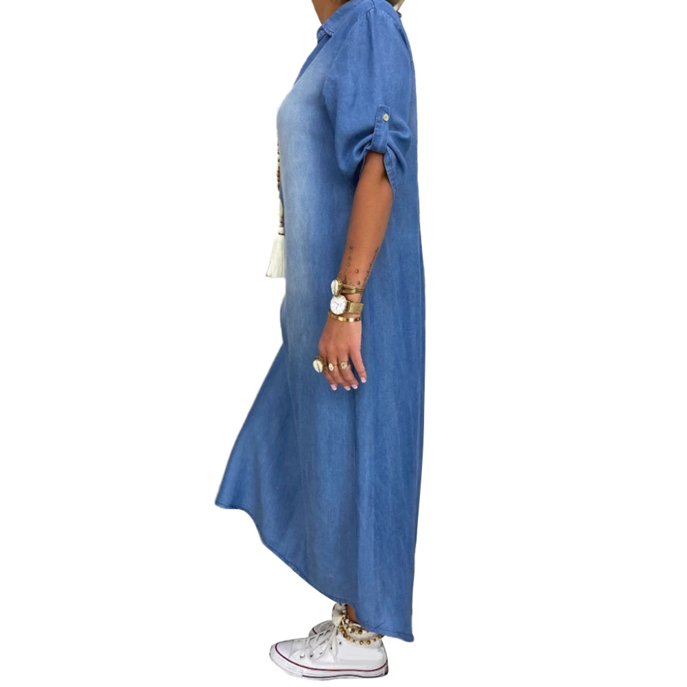 Женское винтажное платье 3XL с V-образным вырезом и отложным воротником, повседневное Свободное длинное джинсовое платье с коротким рукавом и разрезом сбоку, летнее платье
