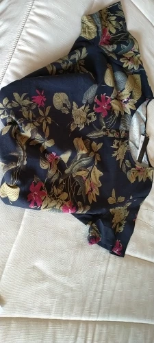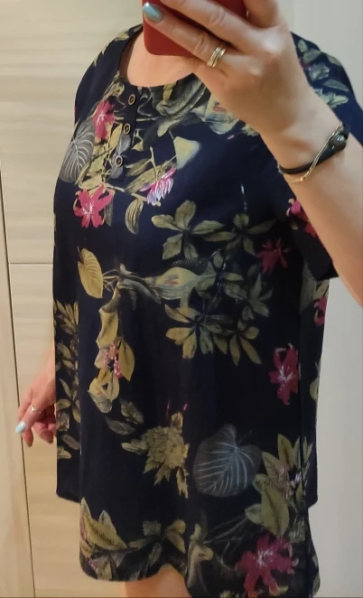 Классная туника. На ог 118 немного оверсайз, можно брать на размер меньше, но мне годится и свободная. Обычно ношу однотонные блузки и майки, а тут соблазнилась цветочками )). То, что я предполагала чёрного цвета, оказалось насыщенным синим, если кому важно. Дитя шести месяцев одобрил, пол часа разглядывал цветочки на мне с воодушевлением.