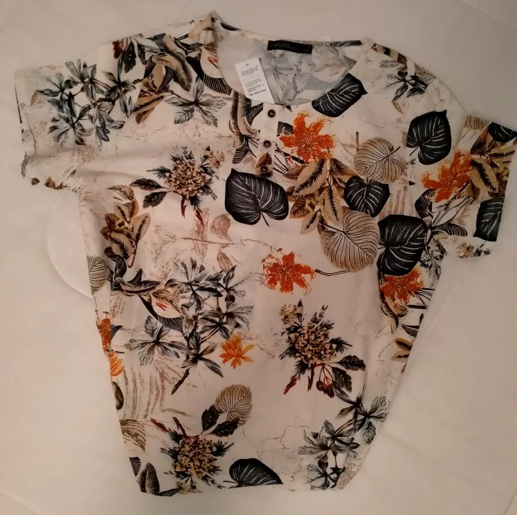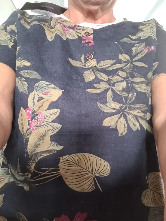 Отличная блузка, очень аккуратно сшита, нитки не торчат, немного ошиблась с размером на 54 российский заказала 4XL, можно было на размер меньше, но мне и так нравится-туника получилась!