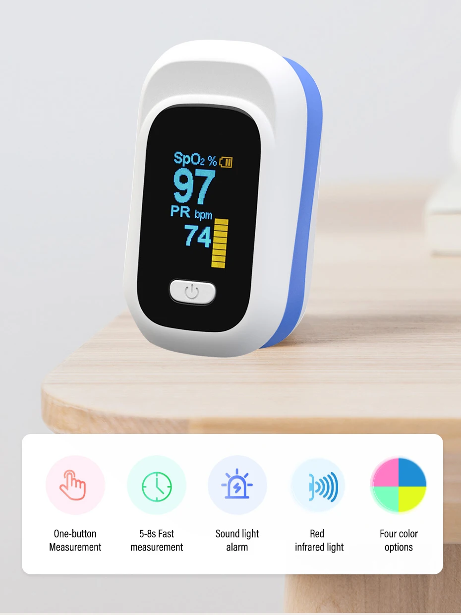 1. Качественный oled-дисплей. 2. Параметры: SPO2 (насыщение кислородом пульса), PR (Частота пульса) 3. Мини, портативный и простой в эксплуатации. 4. Точное считывание, несколько секунд для получения данных. 5. Автоматическое выключение в течение 8 секунд, когда нет сигнала. 6. Подходит для занятий спортом на открытом воздухе, альпинизма и домашнего семейного здравоохранения. 7. Подходит для пожилых людей, людей с проблемами дыхания или людей, которые часто любят спорт.