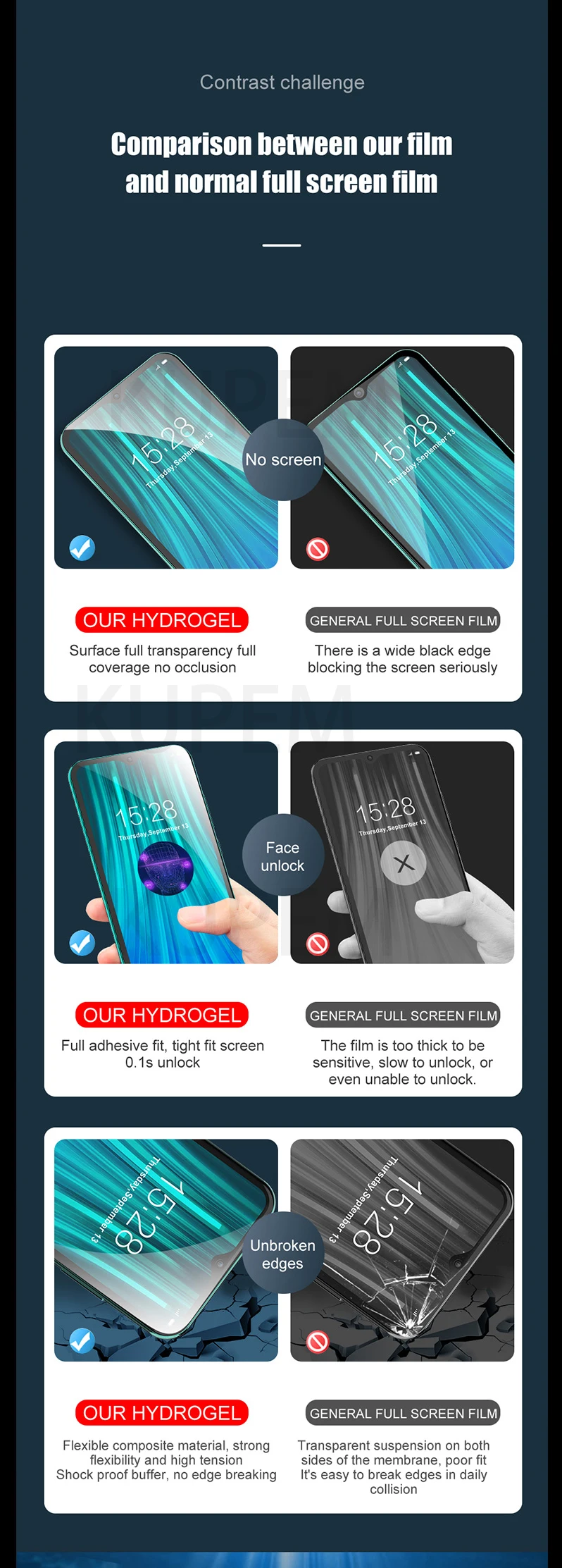 Характеристики и характеристики: -Новая Гидрогелевая мягкая пленка обеспечивает высокую защиту экрана. -Гидрофобное и олеофобное покрытие защищает ваш телефон от пятен, таких как масло, отпечатки пальцев и т. д. -Сверхтонкий и прозрачный дизайн гарантирует качество просмотра в формате HD. -Высокая чувствительность и отклик, как у оригинального экрана -Царапины на экране естественным образом восстанавливаются, чем тонче, тем быстрее -Значительно увеличивает прочность экрана, не нужно беспокоиться, что экран хрупкий для повседневного использования -Гидрогелевая мягкая пленка-самая подходящая защитная пленка на рынке для изогнутых экранов. Руководство по установке: Мы предоставим вам видео, чтобы объяснить установку, новая Гидрогелевая мягкая пленка не требует никаких дополнительных инструментов, упрощает процесс установки Список товаров: 1 x новая Гидрогелевая мягкая пленка для Redmi 1 Набор для чистки 1 специальный скребок