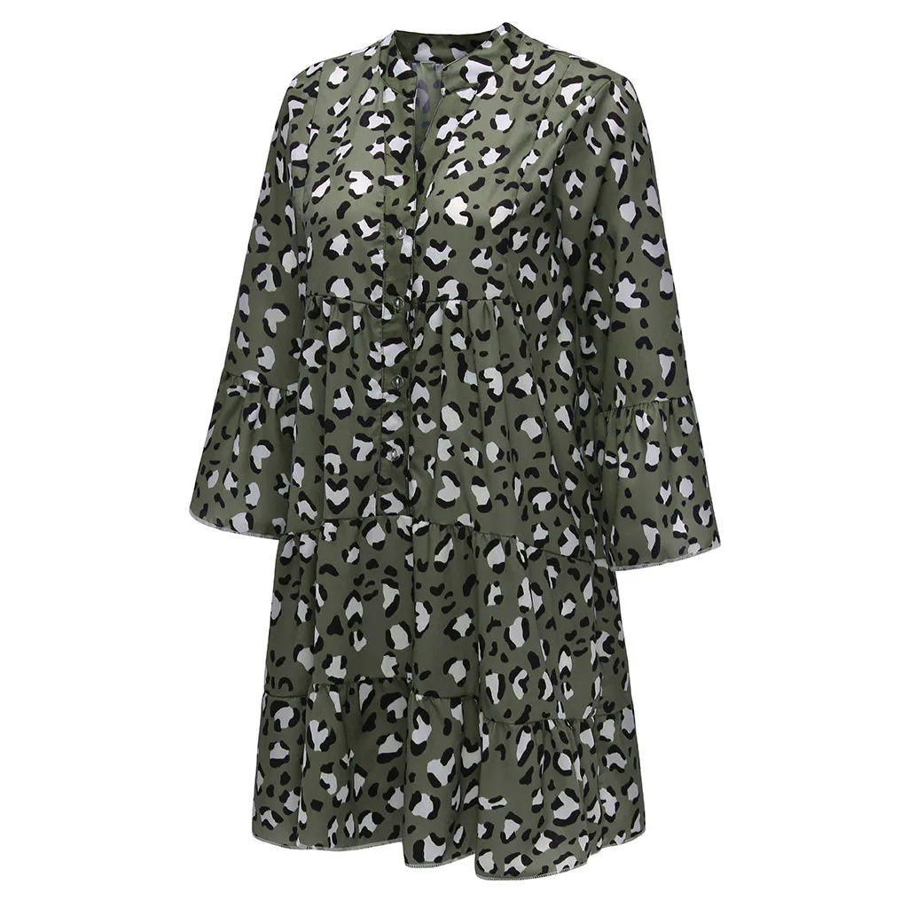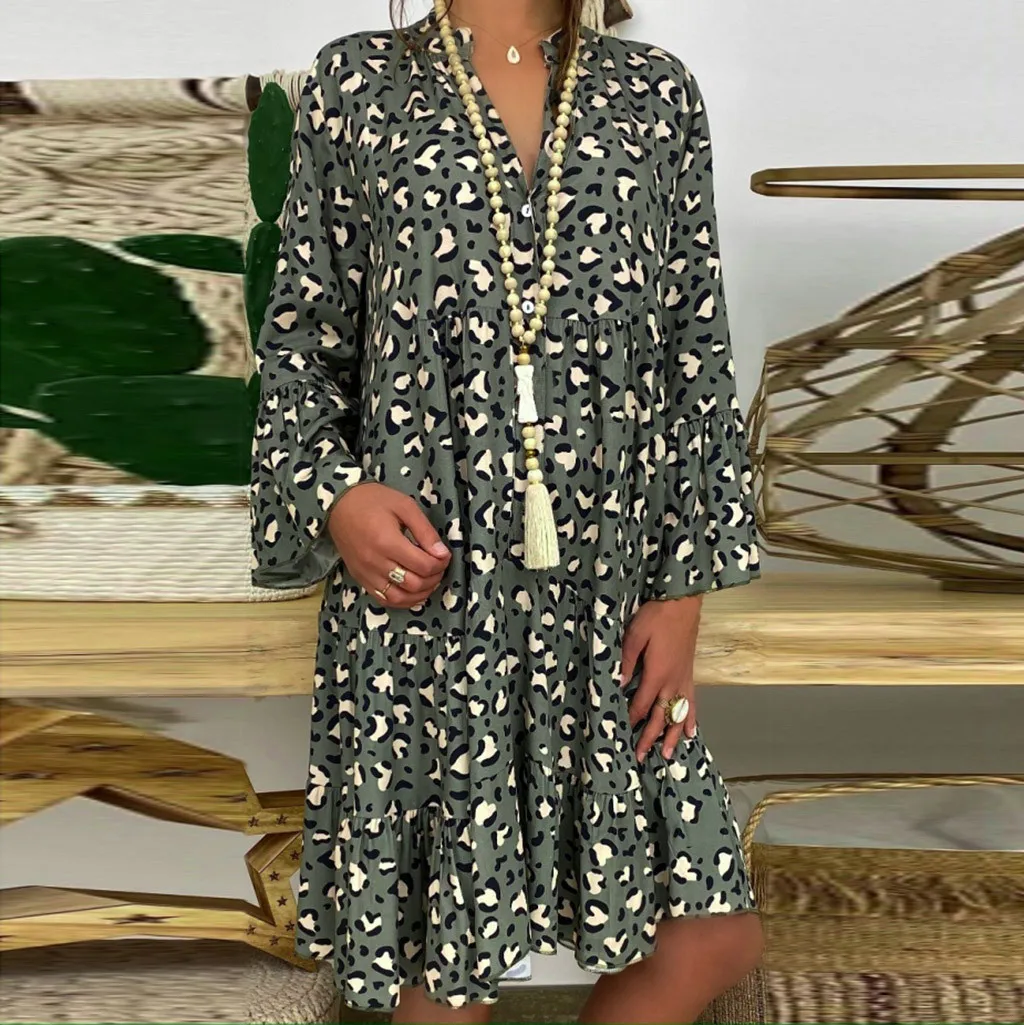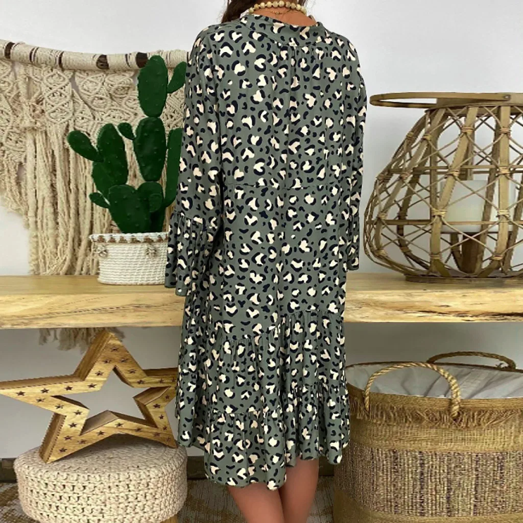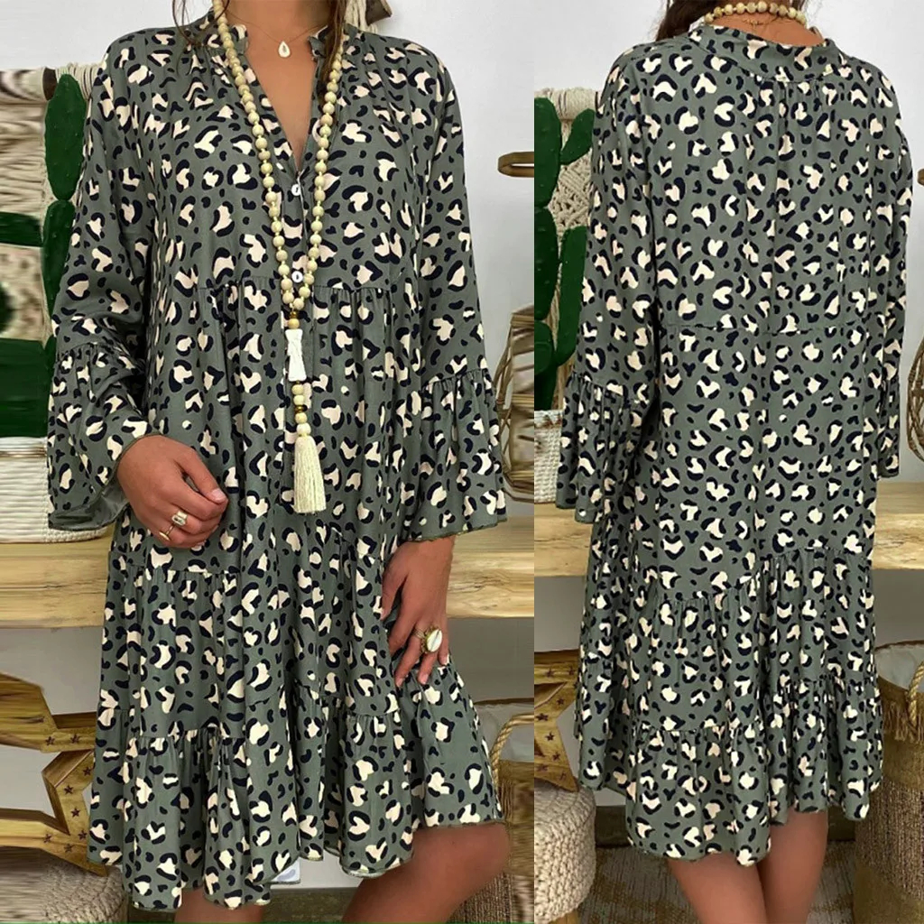 Платье женское размера плюс с длинным рукавом, свободное элегантное мини-платье в стиле бохо, с V-образным вырезом, на пуговицах, с принтом