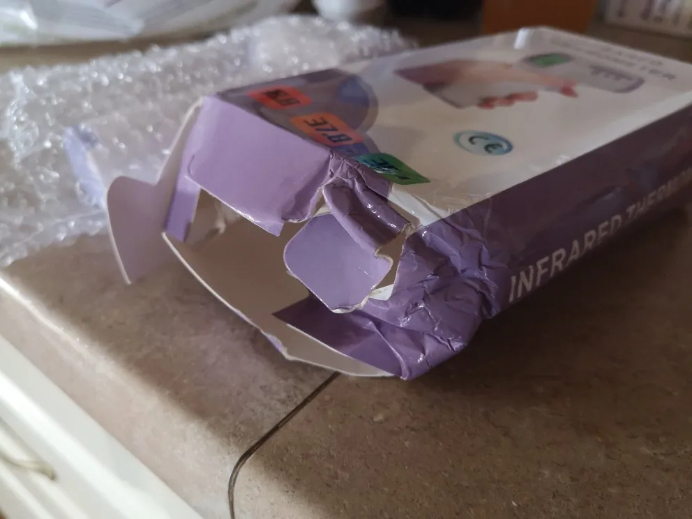 Коробка была довольно раздавлена, но термометр работает нормально. Работает с 2 батареями AAA не входят в комплект