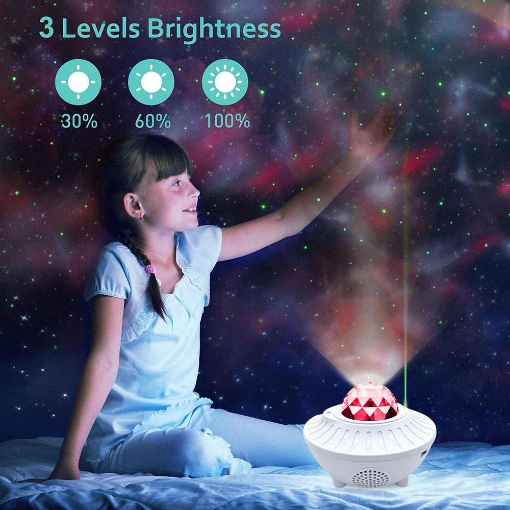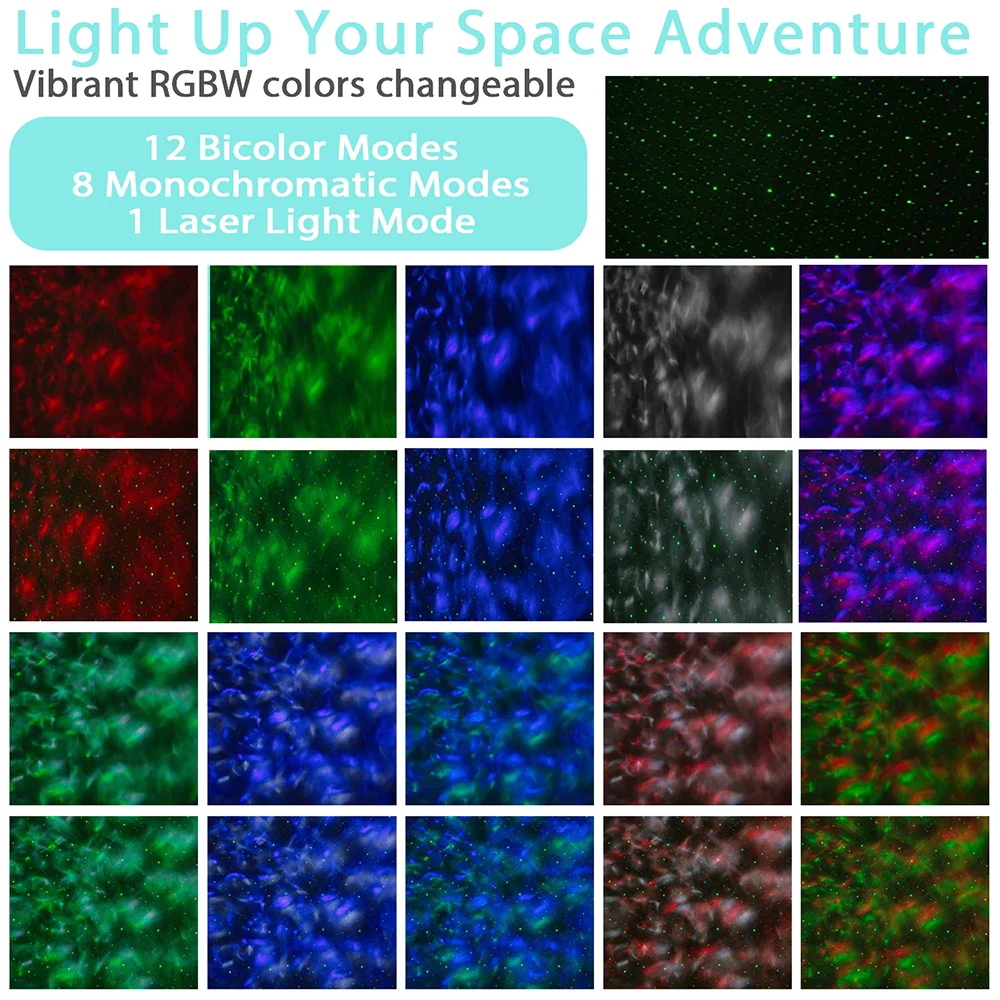 Описание:Особенности:* 21 Цветовая динамическая Проекция: пять стандартных цветов: красная водная волна, синяя водная волна, зеленая водная волна, белая водная волна и зеленая лазерная точка, каждый из двух цветов можно смешивать, а каждый из двух цветов водной волны Также можно смешивать с зеленой лазерной точкой, Таким образом, вы можете получить 21 цвет. Разные цвета в сочетании с динамической ночной проекцией разной скорости, создавая расслабленную, романтическую, красочную атмосферу проецирования пространства, чтобы показать вам великолепный Звездный светильник.* Пульт дистанционного управления и музыка: с пультом дистанционного управления (используются батарейки 2 ААА-не входят в комплект), не нужно беспокоиться о том, чтобы вставить с кровати или дивана, чтобы включить или выключить ночсветильник, пульт дистанционного управления также может управлять светильник жектором, красосветильник Том, регулировкой яркости, свободно включать/выключать лампу, менять режим освещения, Музыкальные песни, таймер. Новейший режим мерцания с активацией звука позволяет проекции менять цвет в соответствии с ритмом музыки или хлопать руками, в результате чего происходит Звездная проекция.* Bluetooth-динамики и таймеры: вы можете выбрать любимую музыку через Bluetooth или USB. Высококачественная музыка и Звездные проекции Создают Романтическую и успокаивающую атмосферу ночью. Вариант таймера более энергоэффективен, вы также можете освещать всю ночь.* Таймер автоматического управления: Звездный прожектор со встроенной динамической Туманностью 1 час, 2 часа, таймер автоматического выключения, ночсветильник-прожектор автоматически отключится после заданного времени. И конечно, таймер можно отменить, чтобы оставаться включенным всю ночь.* Подарки для семьи и детей: ночсветильник со звездным проектором подходит для дня рождения вечерние, свадьбы, декора комнаты, дня детей, Рождества, подарков на годовщину, создает прекрасную звездную атмосферу, помогает детям стимулировать свое любопытство, воображение, творческие способности. Также идеально подходит для украшения помещений в качестве проектора океанских волн, светильник освещения настроения, ночника и прикроватной лампы.* Музыкальный проектор звездного ночника: Звездный светильник может проецировать реалистичную звездную ночь на стены и потолок, создавая хорошую среду для сна для малышей, демонстрируя незабываемую ночь для вашей семьи или друзей.