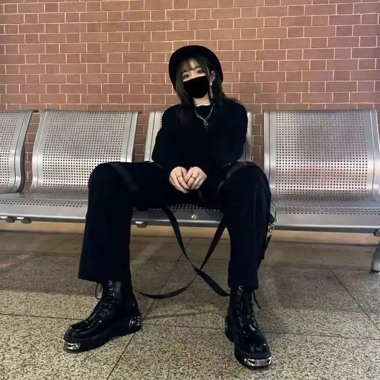 Женские ботильоны в стиле панк, на платформе, черные, мотоциклетные ботинки, с металлическим декором, Прямая поставка