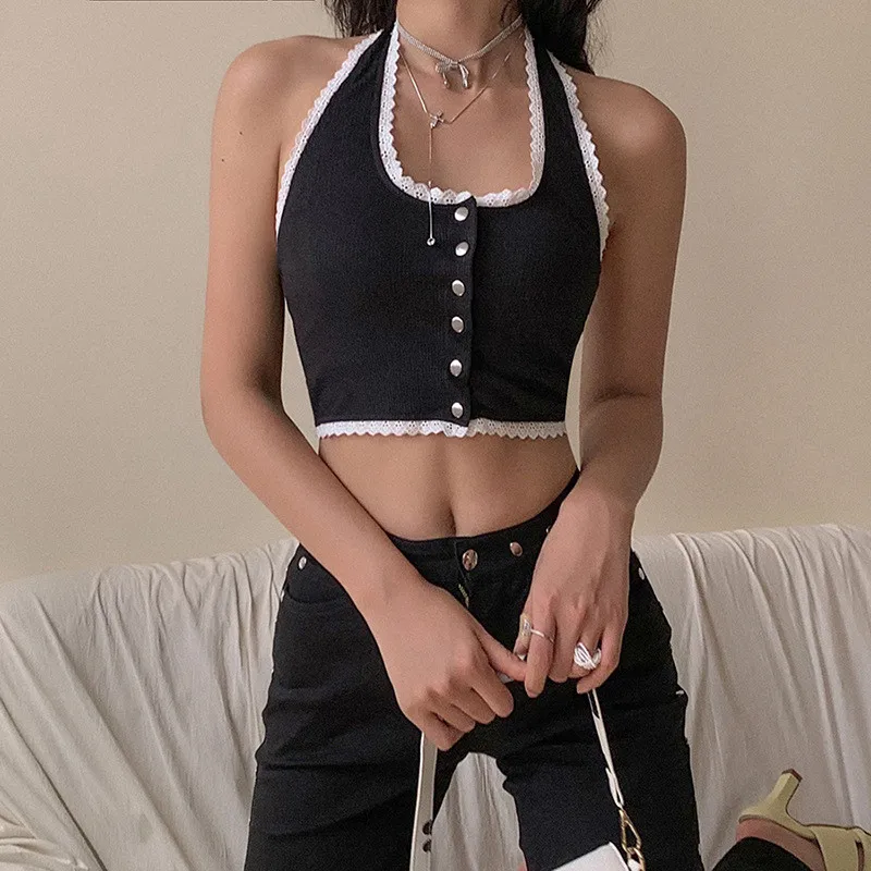 Женский пикантный однотонный кружевной Вязаный топ в стиле пэчворк без рукавов с лямкой на шее и открытой спиной на пуговицах Летние повседневные укороченные топы Жилеты 2021